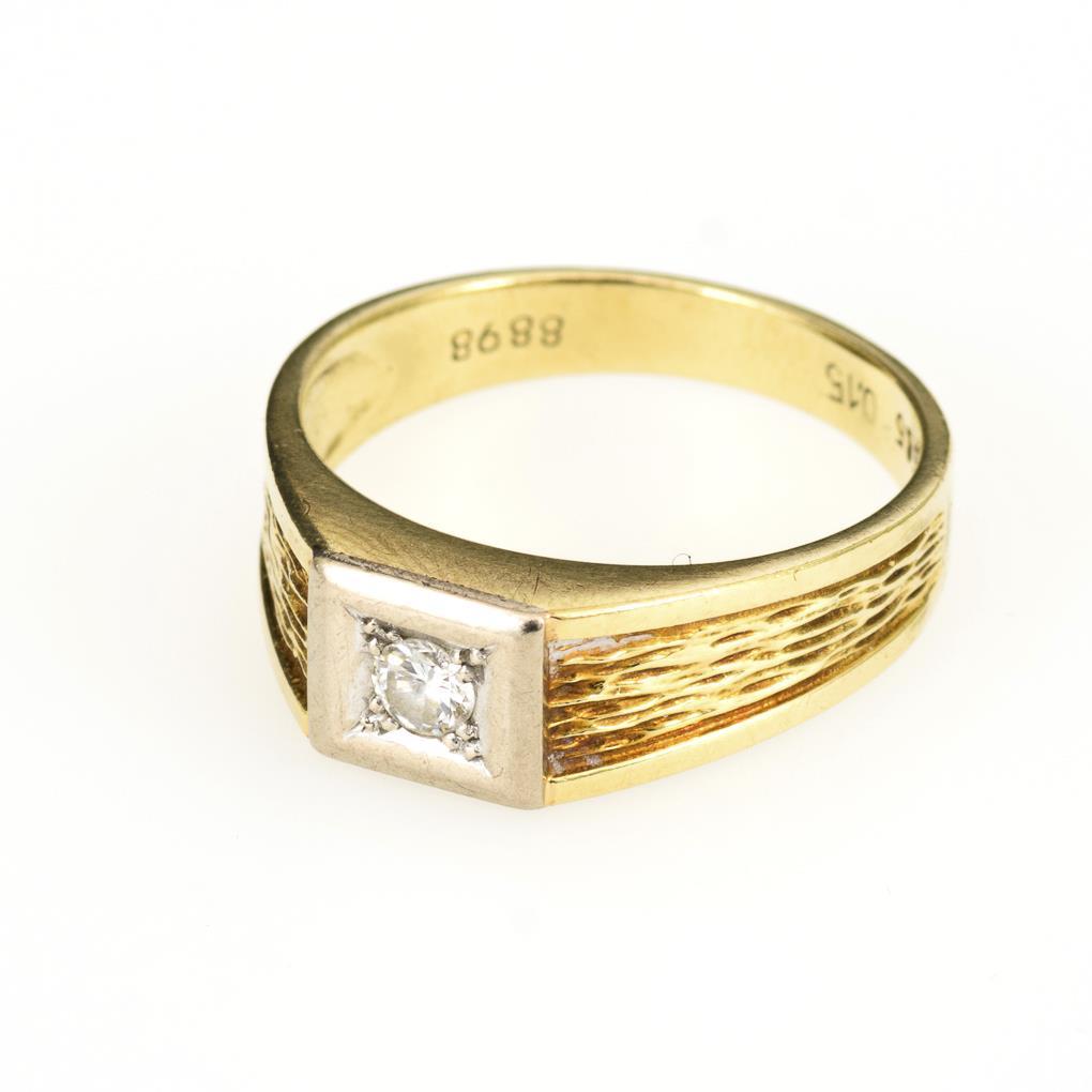 Gelbgold 585 gestempelt. Brillant 0,15 ct gestempelt. Ringgröße 61. 5,7 g.