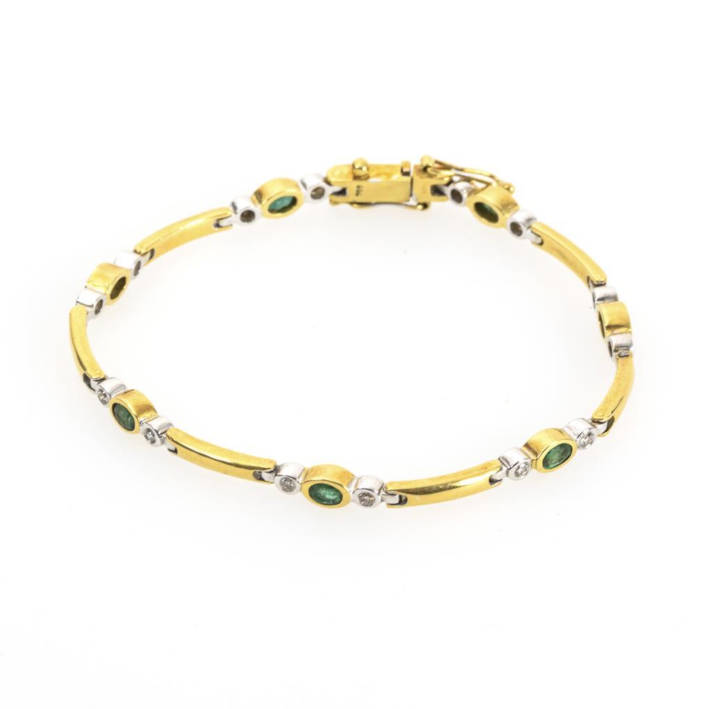 7 Smaragde und 14 kleine Brillanten in Stabgliederkette mit Kastenschloss und 2 Achtersicherungen. Passend zu Halskette Kat-Nr. 386.