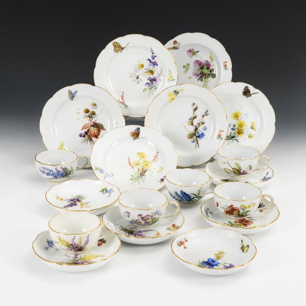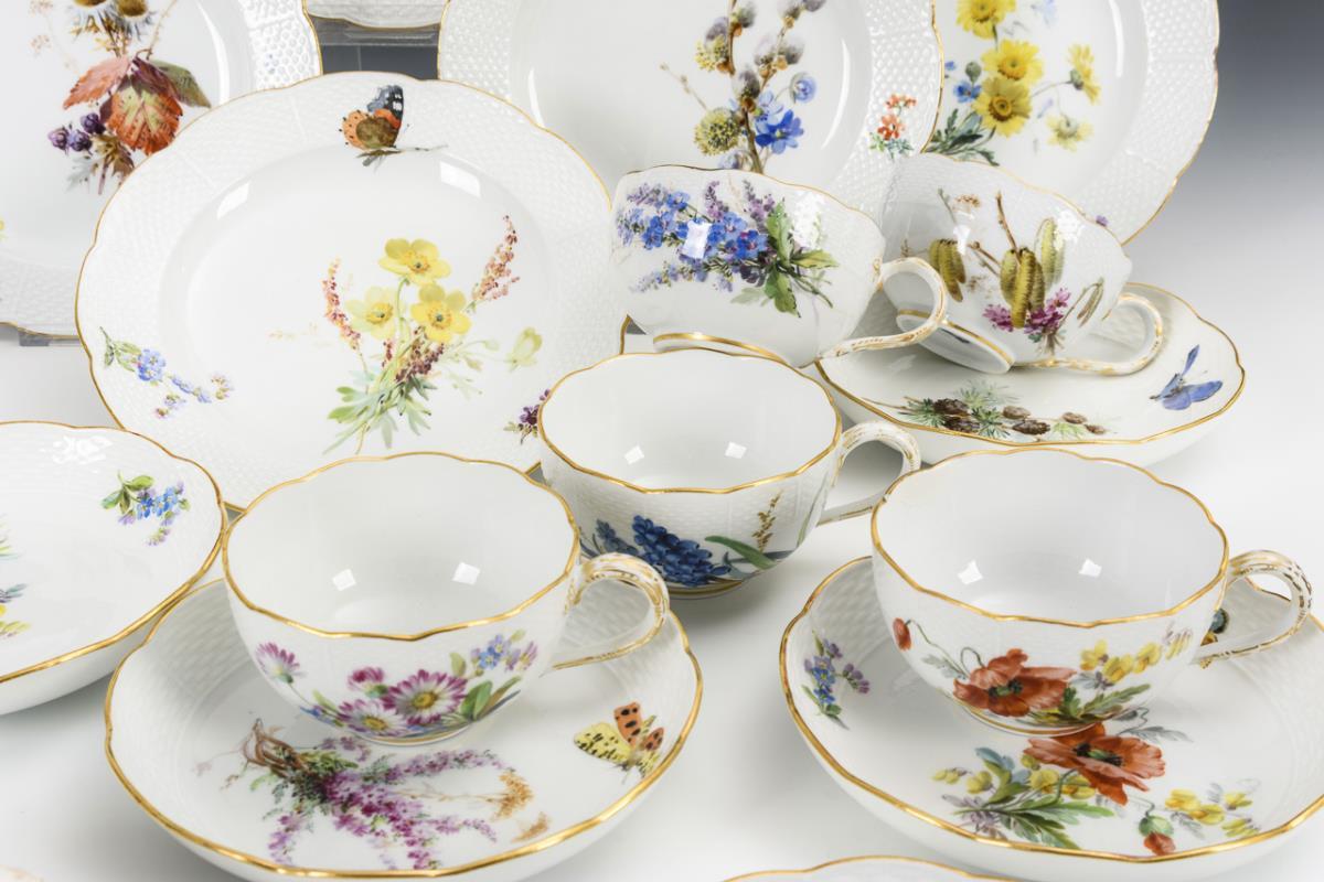 Polychrome Blumen- und Schmetterlingsmalerei, Goldstaffage. 6 Teetassen (H 5 cm), 6 Untertassen (Ø 14 cm) und 6 Kuchenteller (Ø 18 cm).