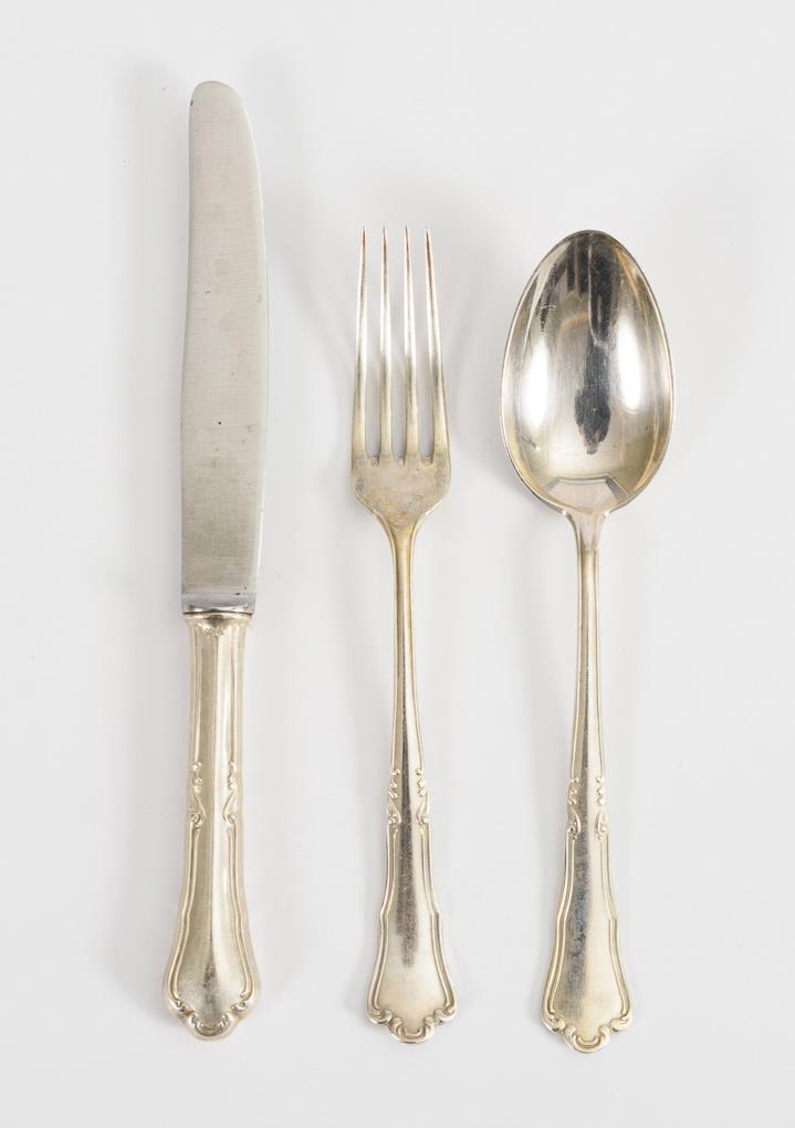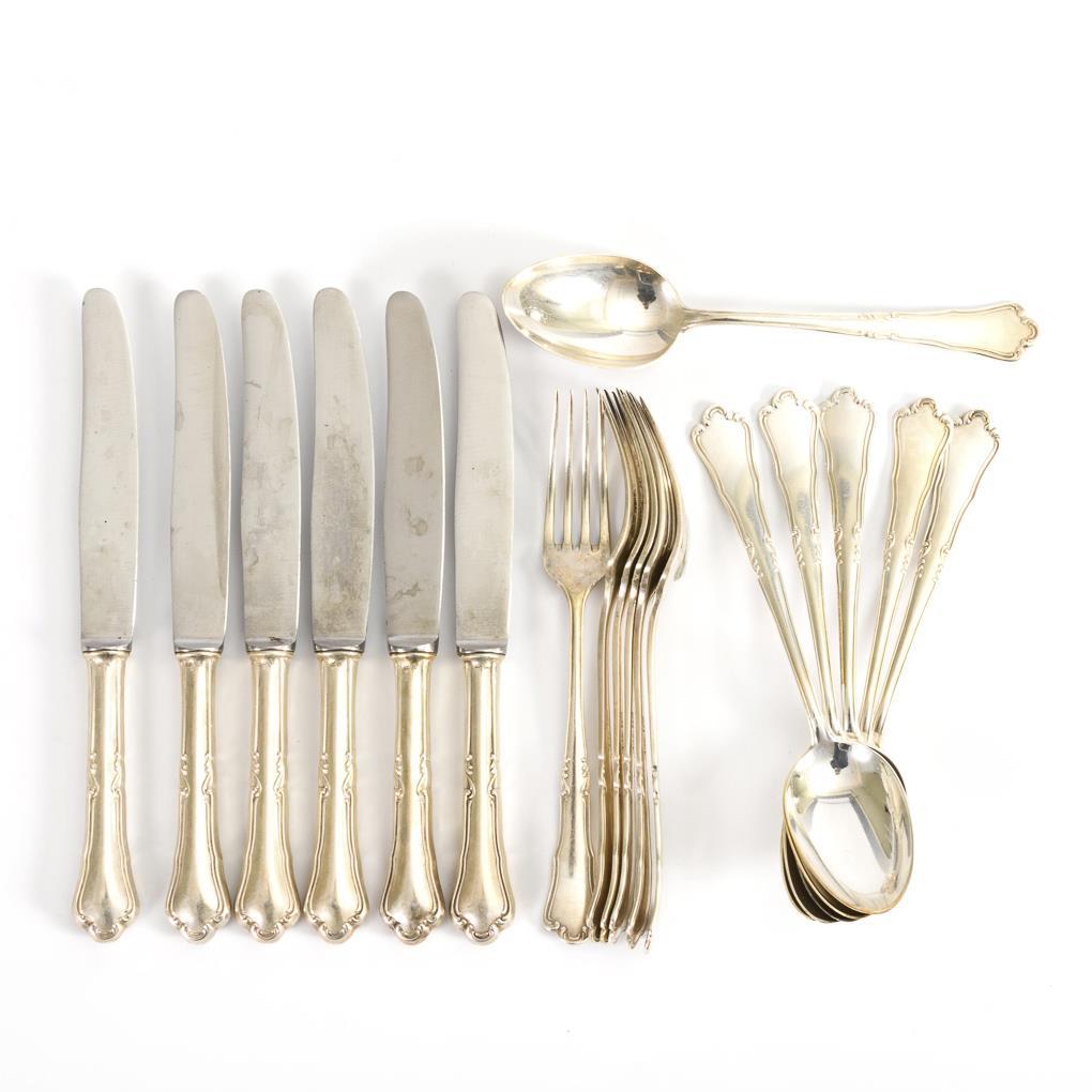 18-teiliges Besteck mit 3-passig geschweiften Griffenden. Je 6 Gabeln, Messer und Löffel. Minimale Gebrauchsspuren.