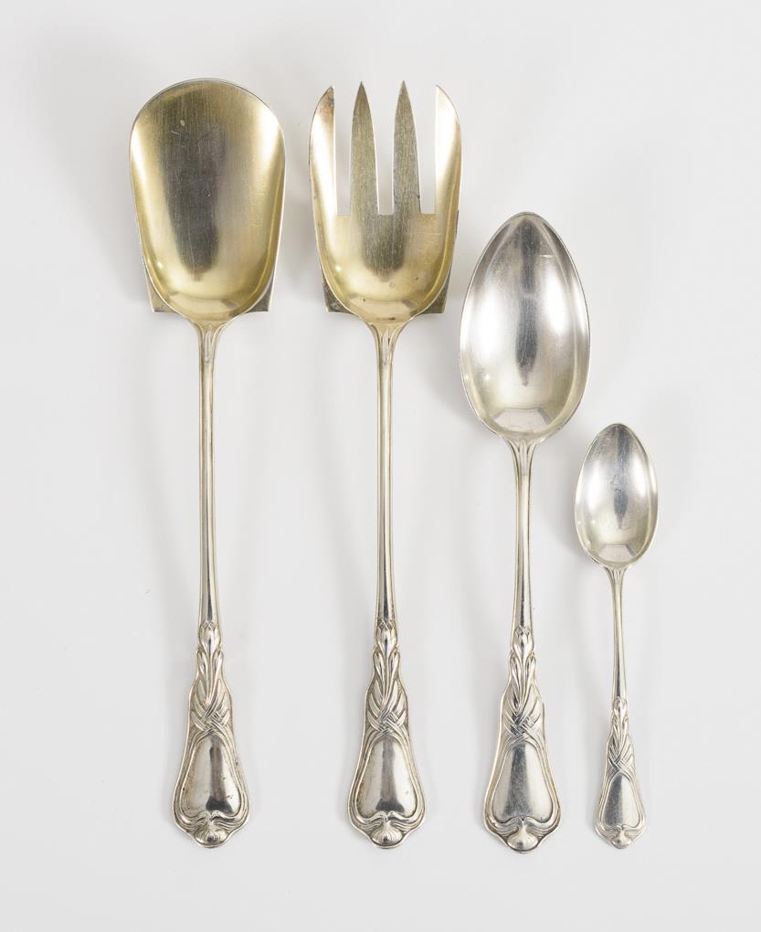 Dekor Nr. 138, "Herbstzeitlose" von Heinrich Vogeler, Worpswede. 13 Teile: 5 Suppenlöffel, 6 Kaffeelöffel und 2-teiliges Salatbesteck. Leichte Gebrauchsspuren.