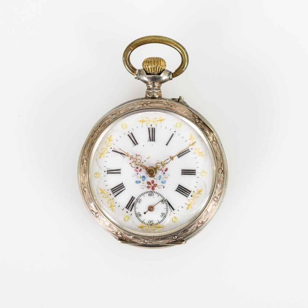 Ungemarktes Werk mit Zylinderhemmung und Kronenaufzug. Läuft. Weißes Emailzifferblatt mit farbigem Floraldekor, römischen Zahlen, Minutenkranz und Louis Quinze-Zeigern.
