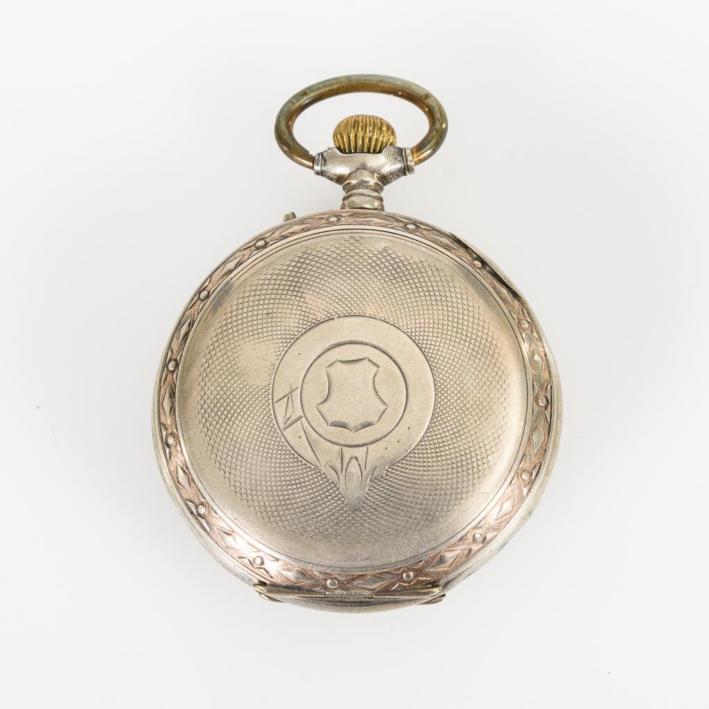 Silberne Taschenuhr mit buntem Zifferblatt.