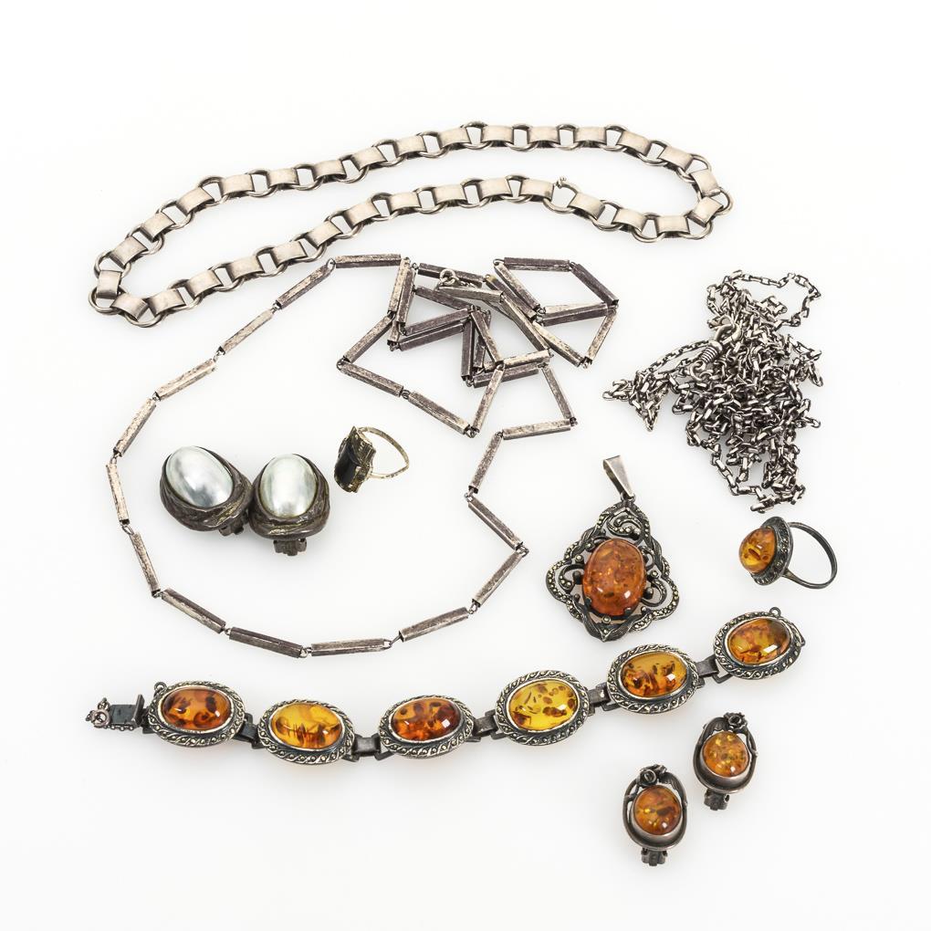 Anhänger, Armband, Ring mit Bernsteincabochons und Markasitbesatz (einige fehlen am Ring), Ohrklipp-Paar mit Bernstein, Ohrklipp-Paar mit Perlmutteinlagen, Ring mit schwarzer Einlage, Uhrenkette mit Karabiner, Stab- und Ringgliederkette mit Ringfederschließen.
