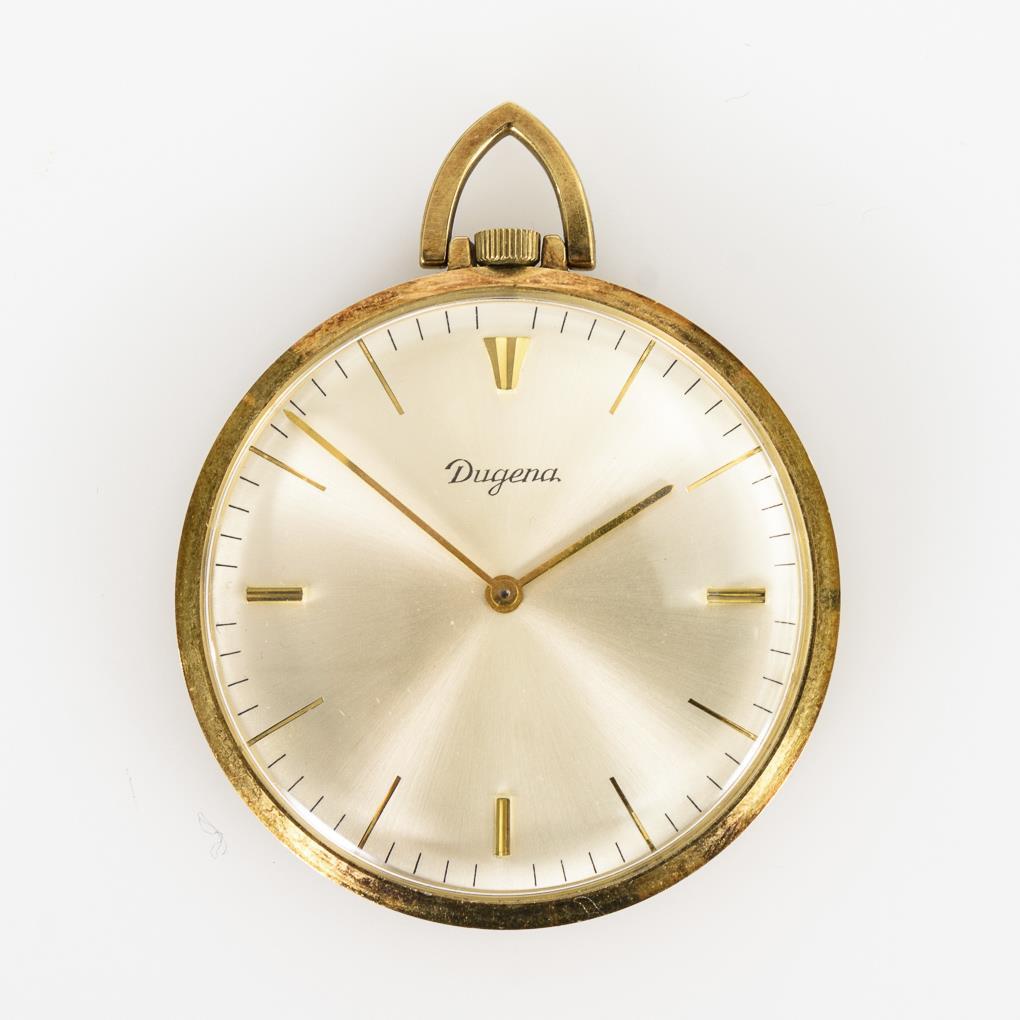 Federwerk mit Kronenaufzug. Läuft. Silberfarbenes Zifferblatt mit Stundenmarkierungen, Minutenkranz und Stabzeigern. Herstellerprägung Anzeige: Dugena.