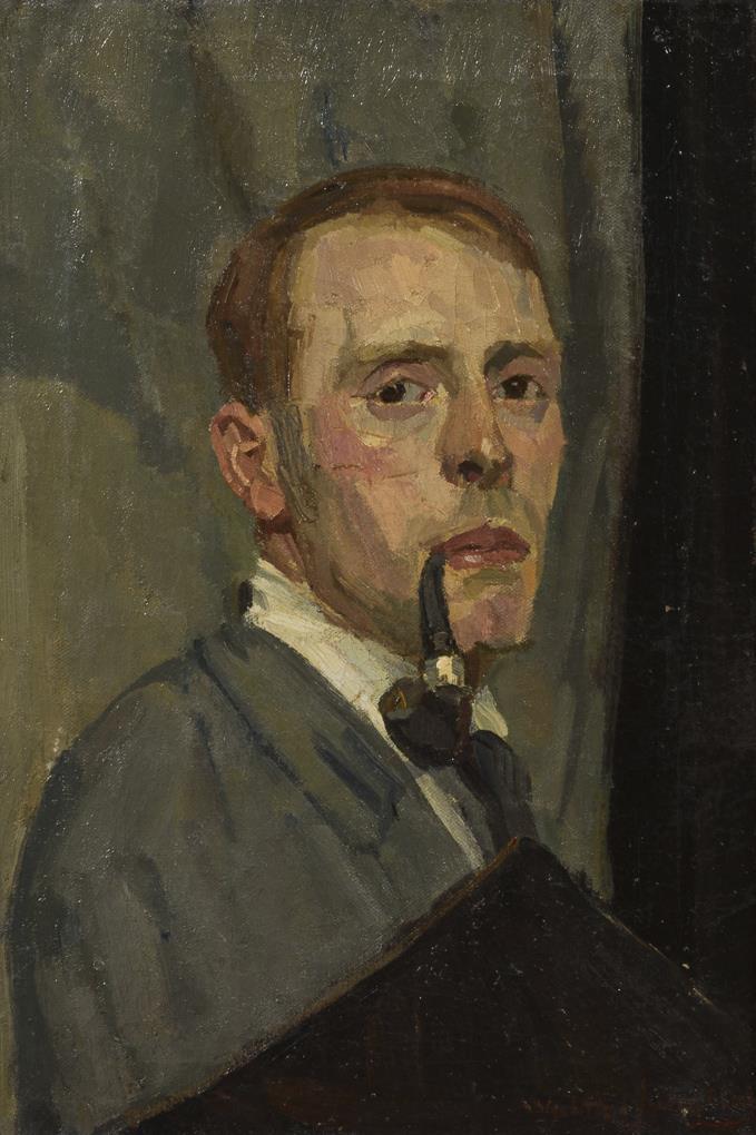 Porträt eines jungen Mannes im grauen Anzug, mit Pfeife im Mund. Minimale Altersspuren.