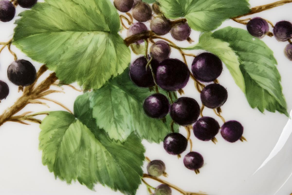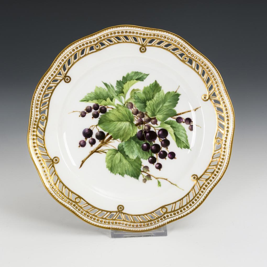 Teller mit stabdurchbrochener Fahne, im Spiegel jeweils ein Fruchtbukett mit Brombeeren, Johannisbeeren bzw. Haselnüssen.