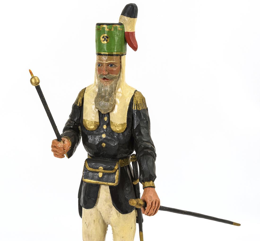 Handgearbeitete Figur eines bärtigen Bergmannes in Tracht. Rechter Arm geklebt, leichte Trockenrisse.