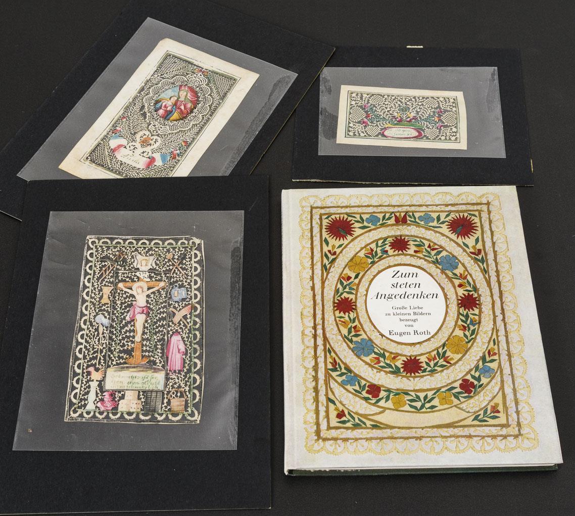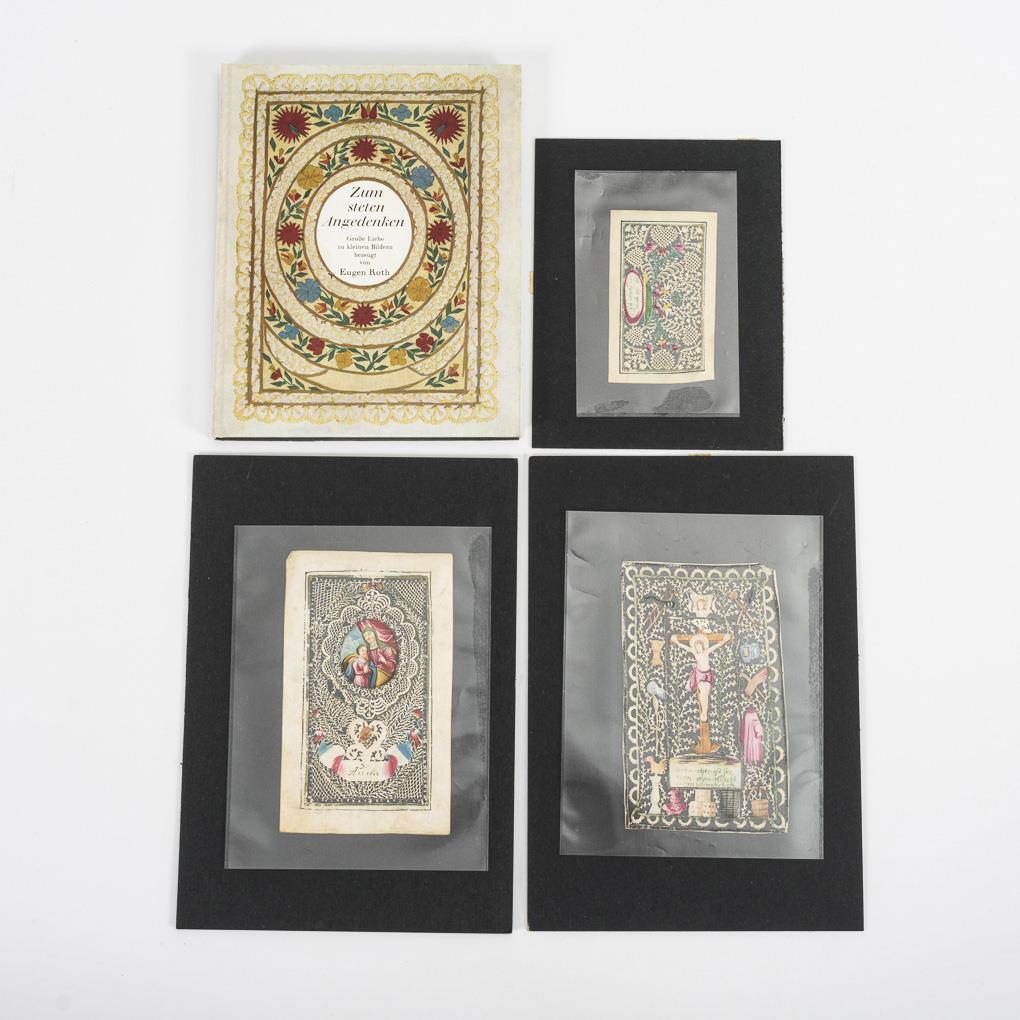 St. Anna mit Tochter Maria, Kreuzigung mit Arma Christi bzw. Tauben am Monogramm. Teils sehr feine Schnittarbeit. Dazu das Buch "Zum steten Angedenken" von Eugen Roth, München 1964. Wenige Alters-/Gebrauchsspuren.