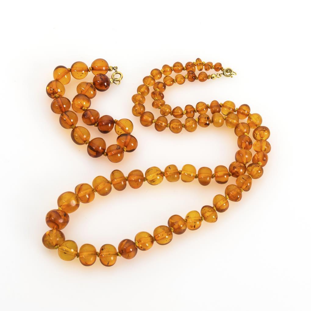 Schnürketten mit klaren Bernsteinen in Einzelverknotungen, an Ringfederschließen.
