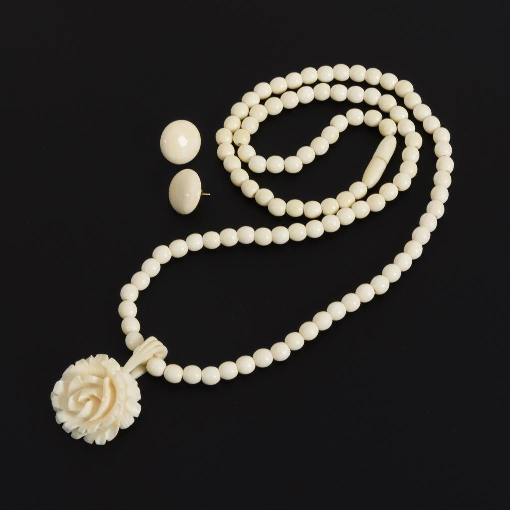 Kugelkette an Schraubverschluss. Anhänger mit geschnitzter Rose und Ohrsteckerpaar mit Cabochons an Steckmechanik.