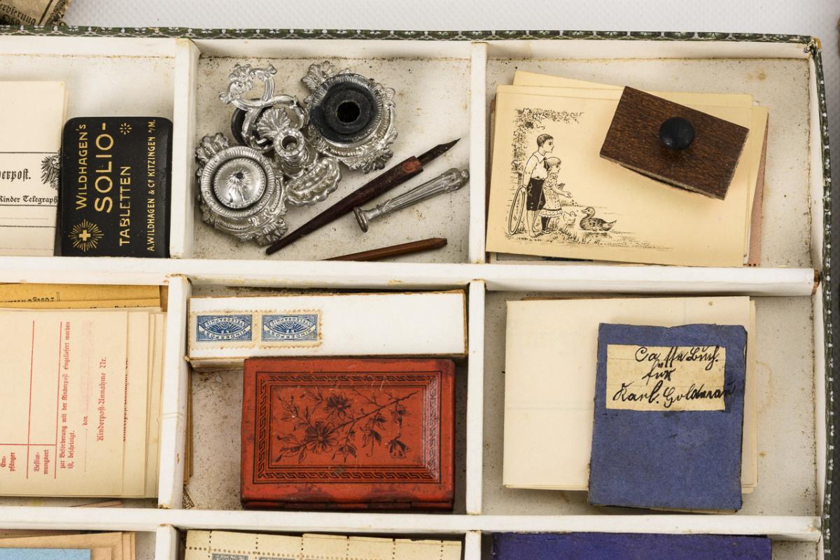 Kinderpost No. 4324 (DRGM 98393) mit wohl meist originalem Zubehör. / Manöver Spiel No. 2164 (W & S B, wohl Werner & Schumann Berlin) mit farbig lithografiertem Spielbrett, Holzfiguren und originaler Anleitung. Vollständigkeit nicht geprüft, Kartons mit Altersspuren und kleinen Defekten.