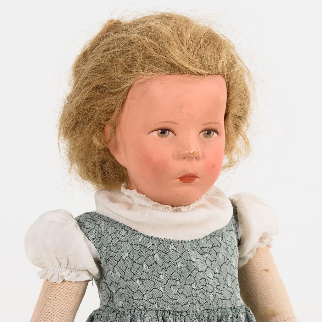 Fester Kurbelkopf, handgeknüpfte Echthaarperücke. Körper aus grobem Stoff, mit locker angenähten Armen, Beine mit Scheibengelenken. Graues Kleidchen, weiße Schuhe. Nasenspitze bestoßen, Körper minimal verschmutzt.