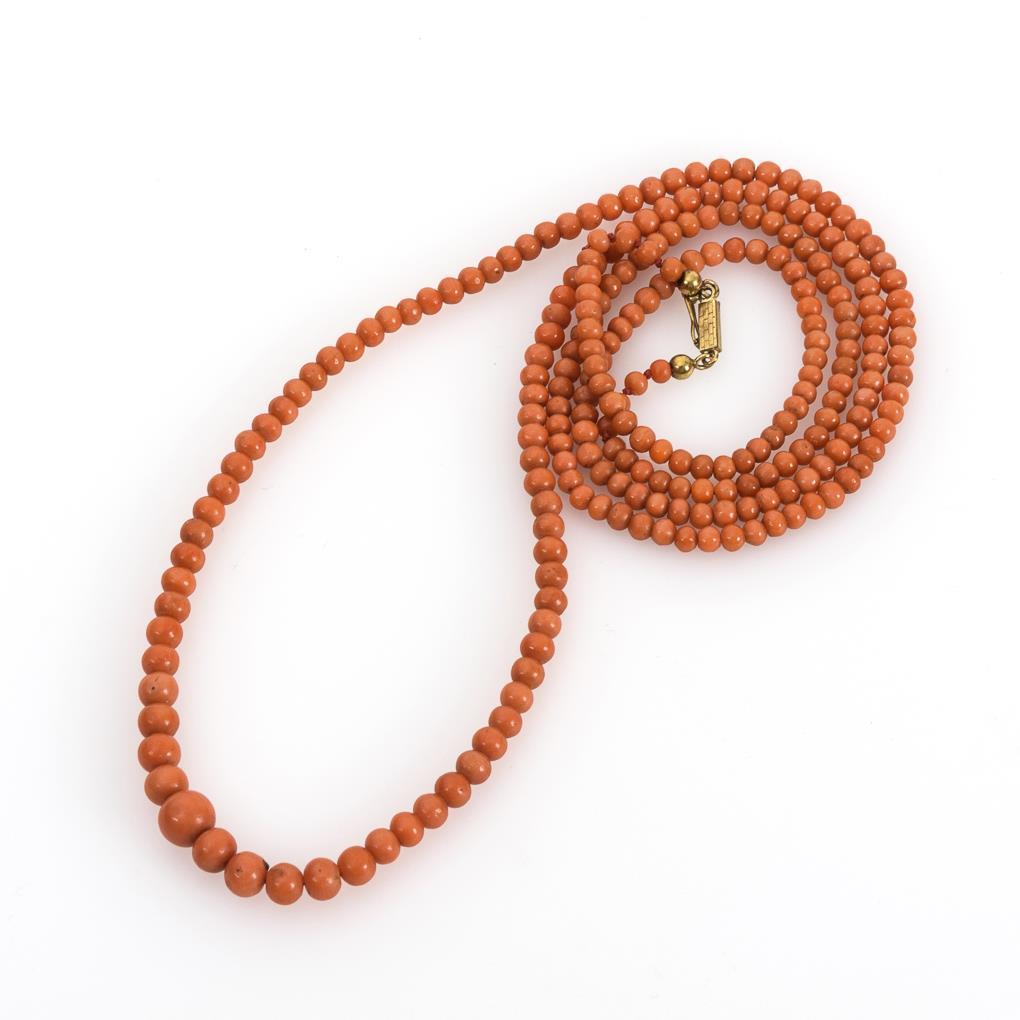 Schnürkette mit Korallenkugeln im leichten Verlauf, an Kastenschloss mit Achtersicherung.