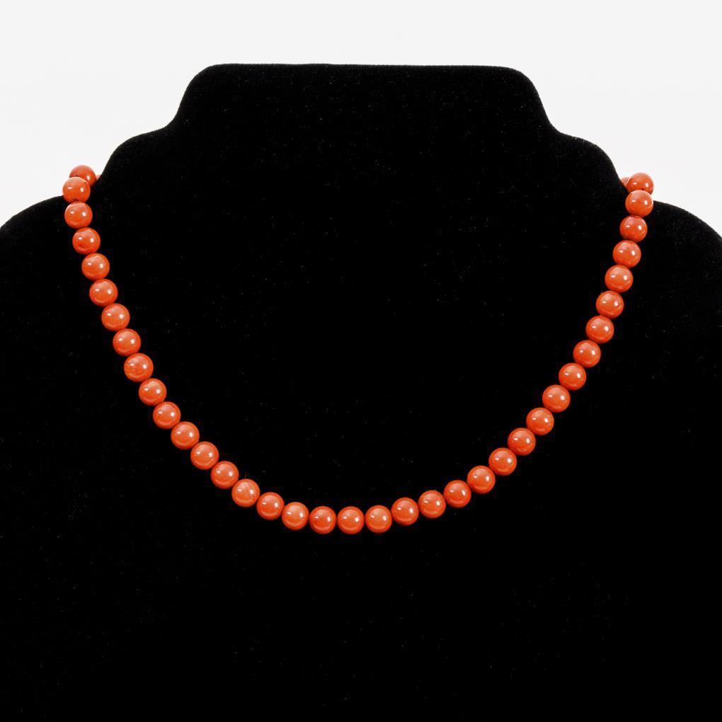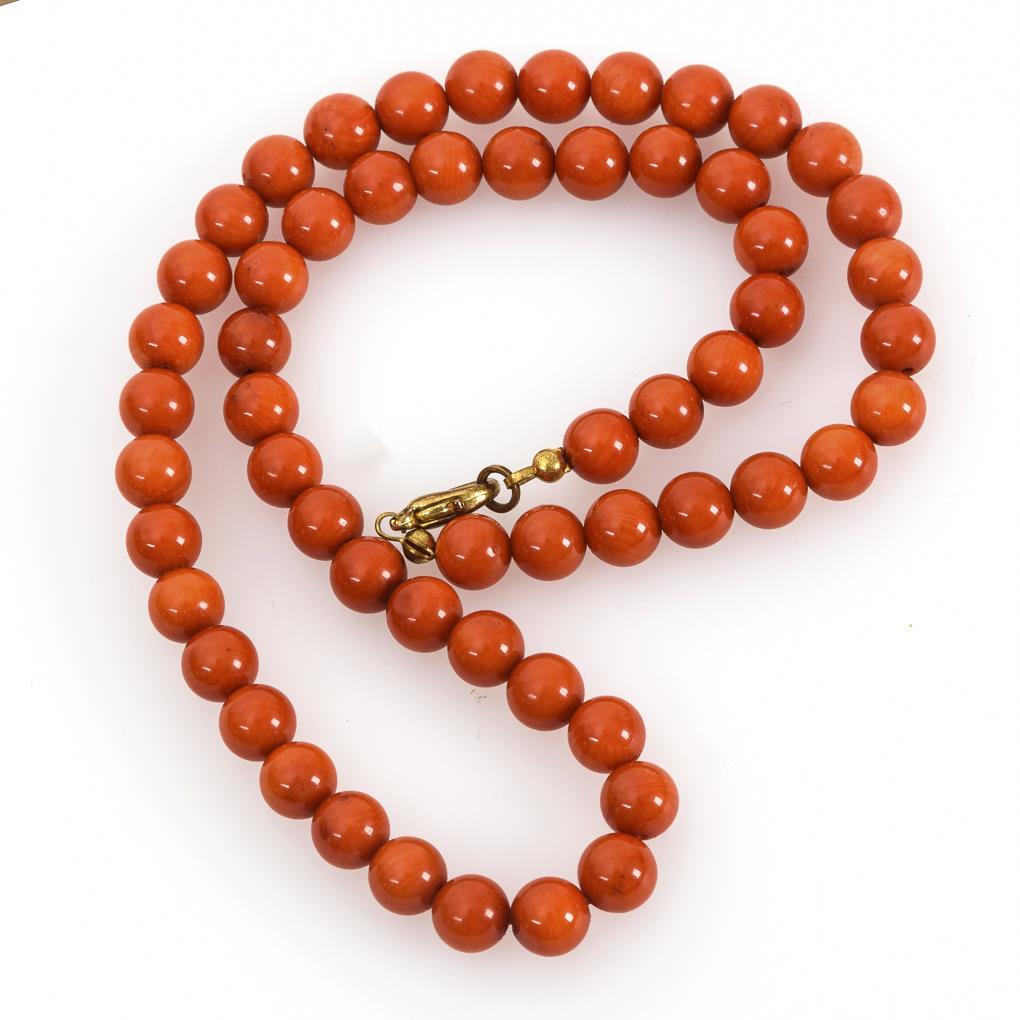 Schnürkette mit Korallenkugeln, an Karabinerschließe.