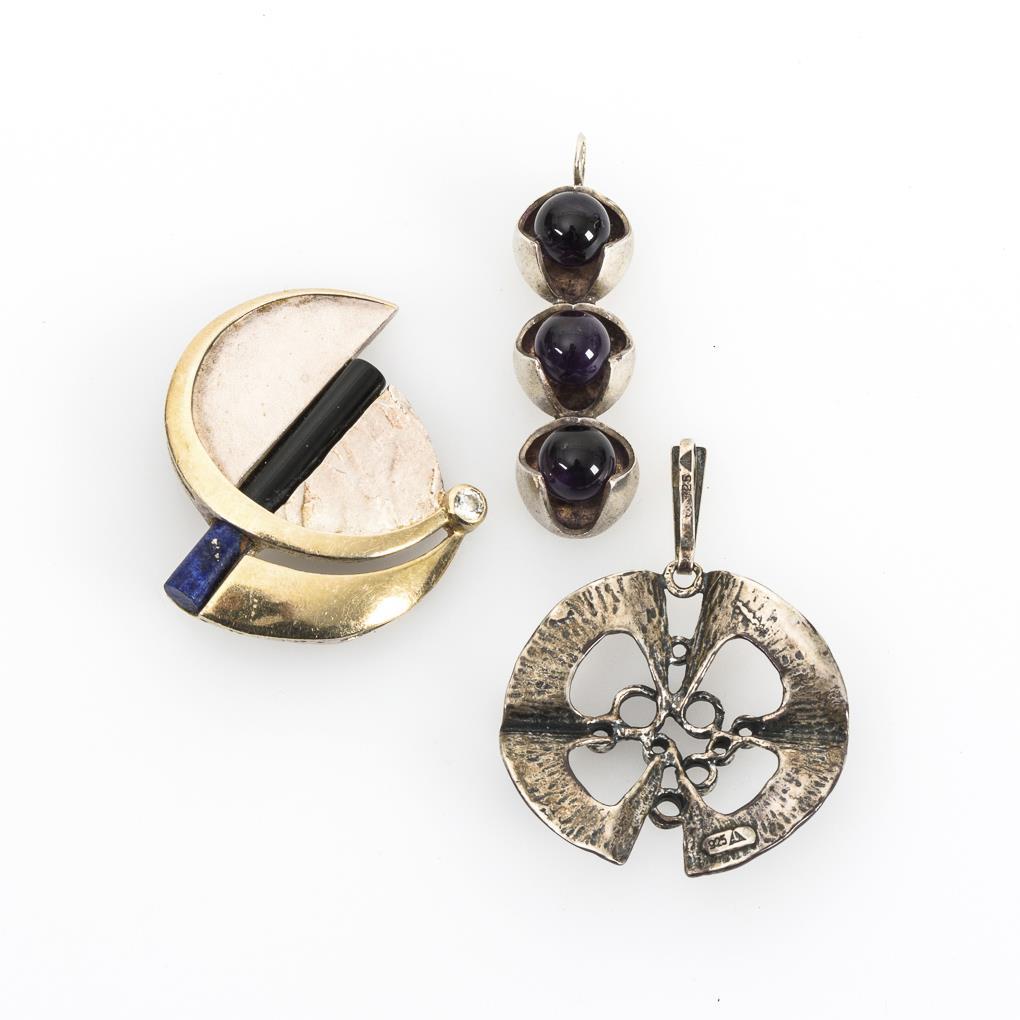 Strukturierte Anhänger mit Lapislazulistab, Zirkonia und 3 Amethystkugeln.
