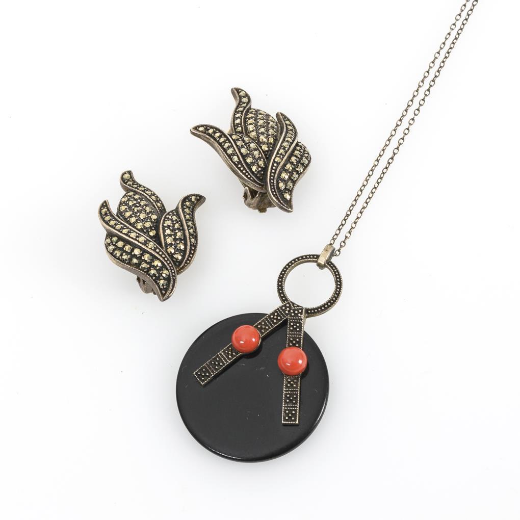 Kunststoff?-Anhänger mit Silbermontierung und 2 roten Cabochons, an zarter Ankerkette mit Ringfederschließe. Ohrklipps mit Markasitenbesatz und einfacher Klippmechanik.