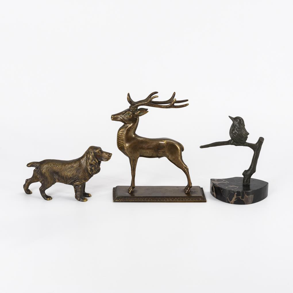 3 jagdliche Bronzen: Hirsch, Hund sowie Vogel auf einem Ast