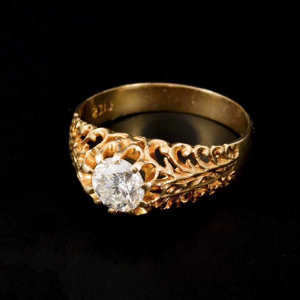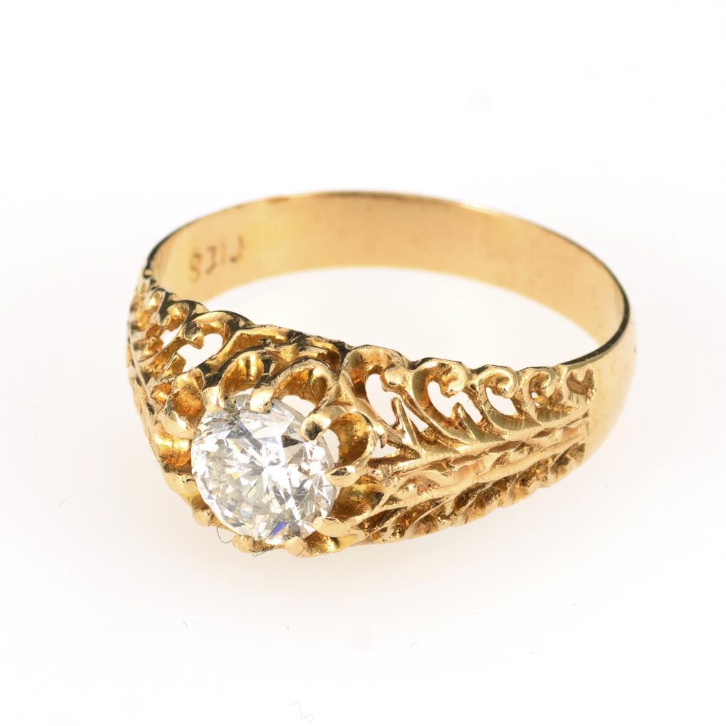 Gelbgold 585 gestempelt. Brillant ca 1,0 ct/G-H/si-PI, Ringgröße 57. 3,1 g.