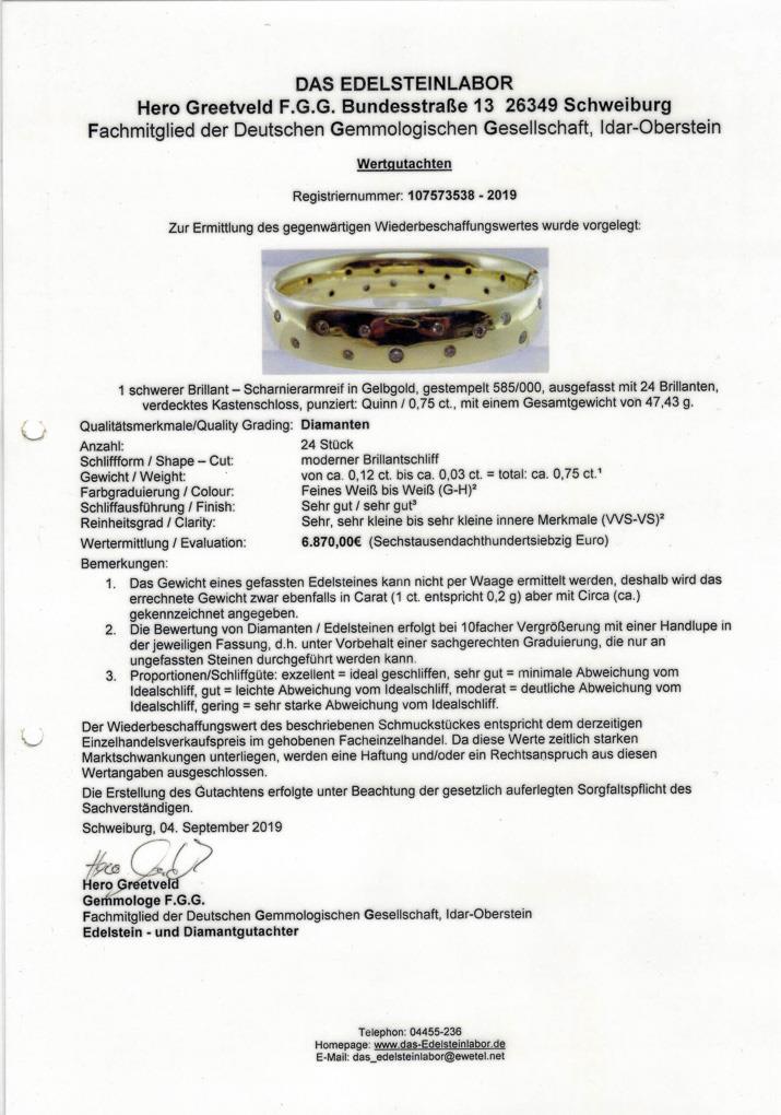 Gelbgold 585 gestempelt. Brillanten zus. 0,75 ct gestempelt/G-H/vvs-vs, Reif Ø 6 cm, Breite 1,5 cm. 46,8 g.