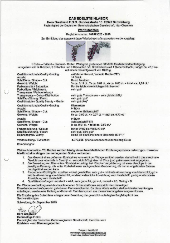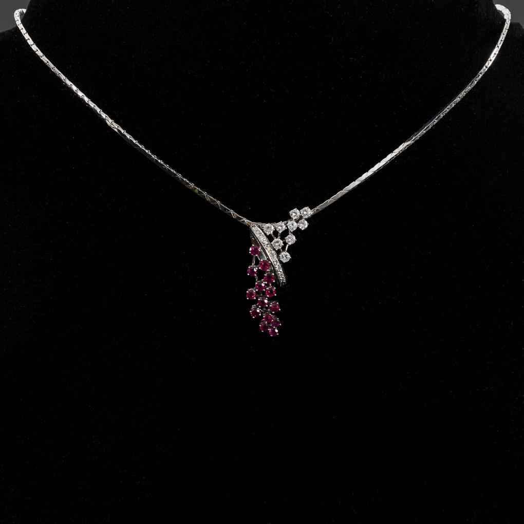 Weißgold 585 gestempelt. Schauteil 4 x 2 cm, Rubine zus. ca. 1,06 ct, behandelt, Brillanten zus. ca. 0,73 ct, Diamanten zus. ca. 0,09 ct/G-H/si-PI, Kette L 42,5 cm. 16,65 g.