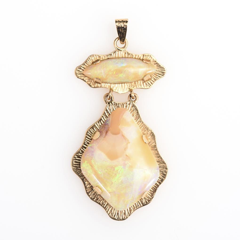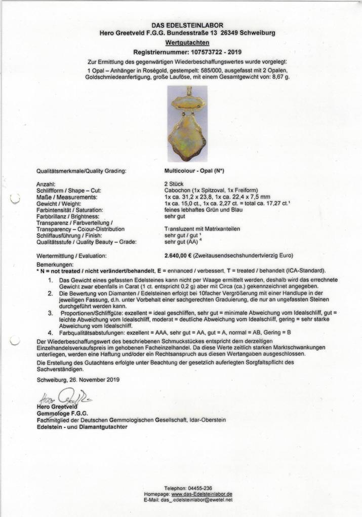 Roségold 585 gestempelt. Opal zus. ca. 17,27 ct, Anhänger 5 x 3 cm. 8,67 g.