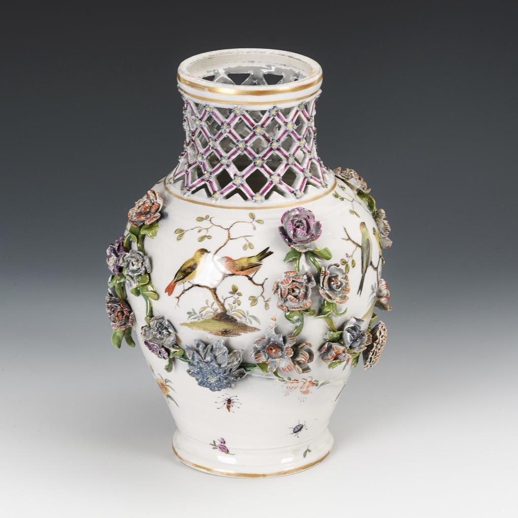 Wohl nach einem Modell der Porzellanmanufaktur Höchst. Balusterkorpus mit aufgelegten Blütenfestons und gitterartig durchbrochenem Hals. Mit Vogel- und Insektenmalerei. Ohne Deckel. Brandriss an der Wandung, partiell rauchartige Glasurverfärbungen, Blüten und Blätter partiell restauriert und bestoßen.