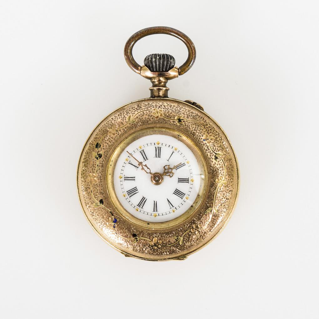 You are here:   Home Categories Clocks & Watches Goldene Damentaschenuhr mit farbigen Emailblüten