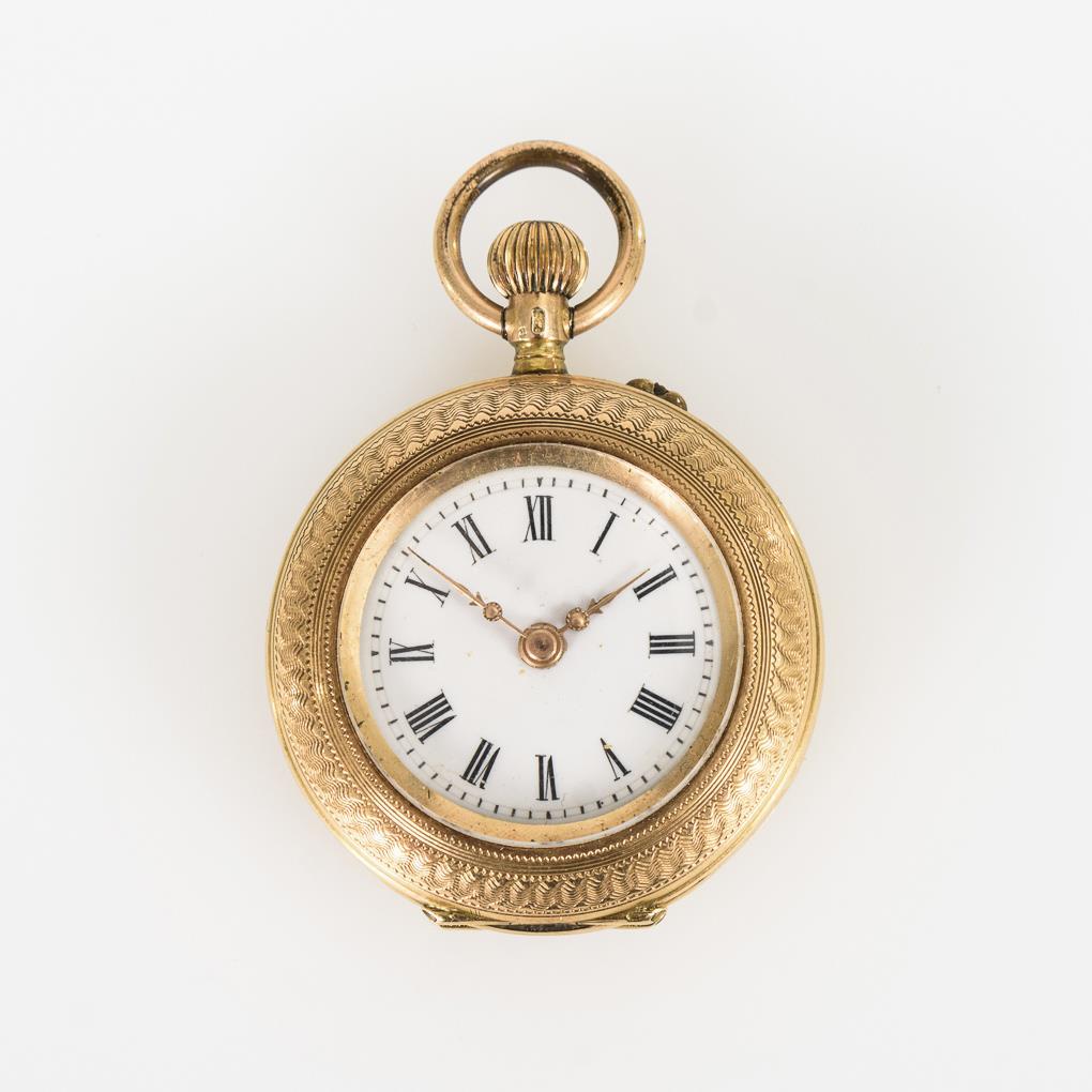 Ungemarktes Werk mit Zylinderhemmung und Kronenaufzug. Läuft. Weißes Emailzifferblatt mit römischen Zahlen, Minuterie und Flèche-Zeigern.