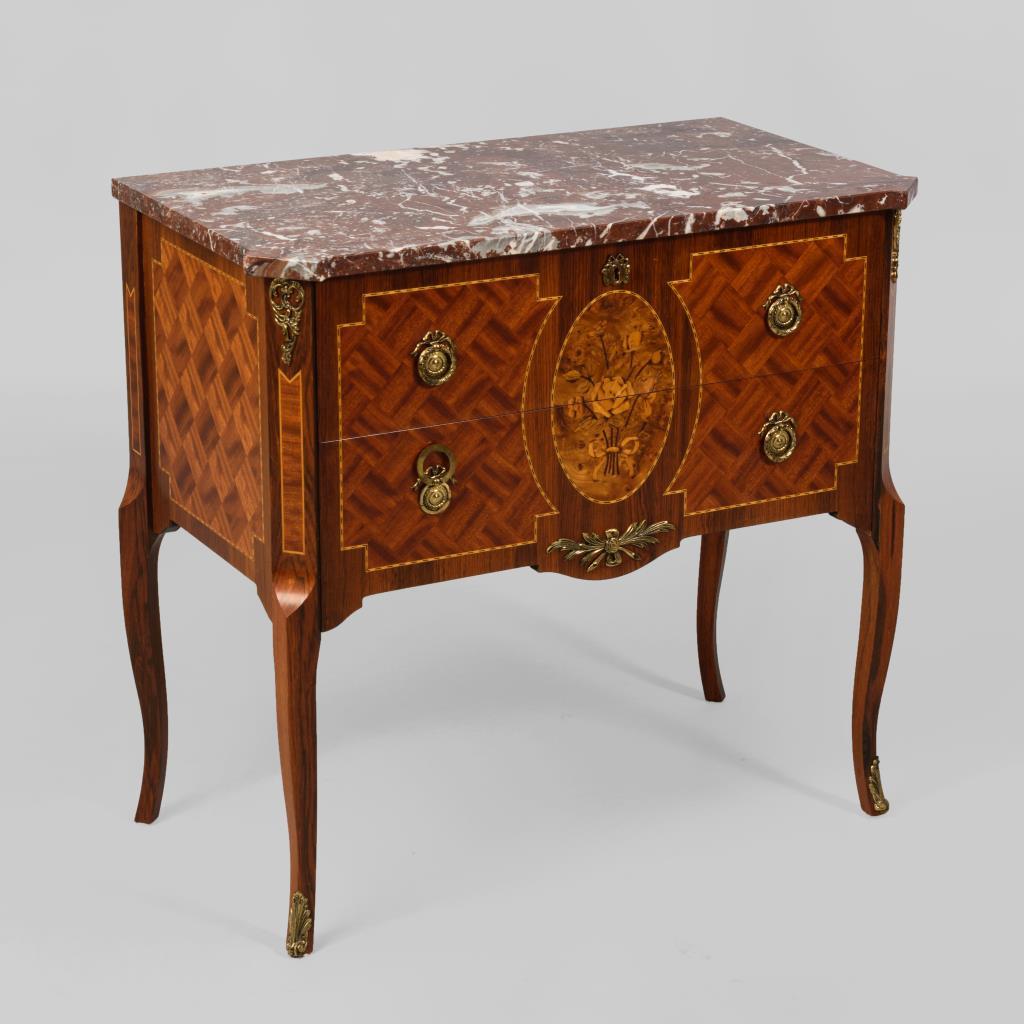2-schübige Kommode in Transition-Stil auf leicht ausgestellten Beinen, marketiert mit Blumenkartusche und geometrischen Mustern, verziert mit Messing-Ringgriffen und -Applikationen, rote Marmorplatte. Alters-/Gebrauchsspuren.