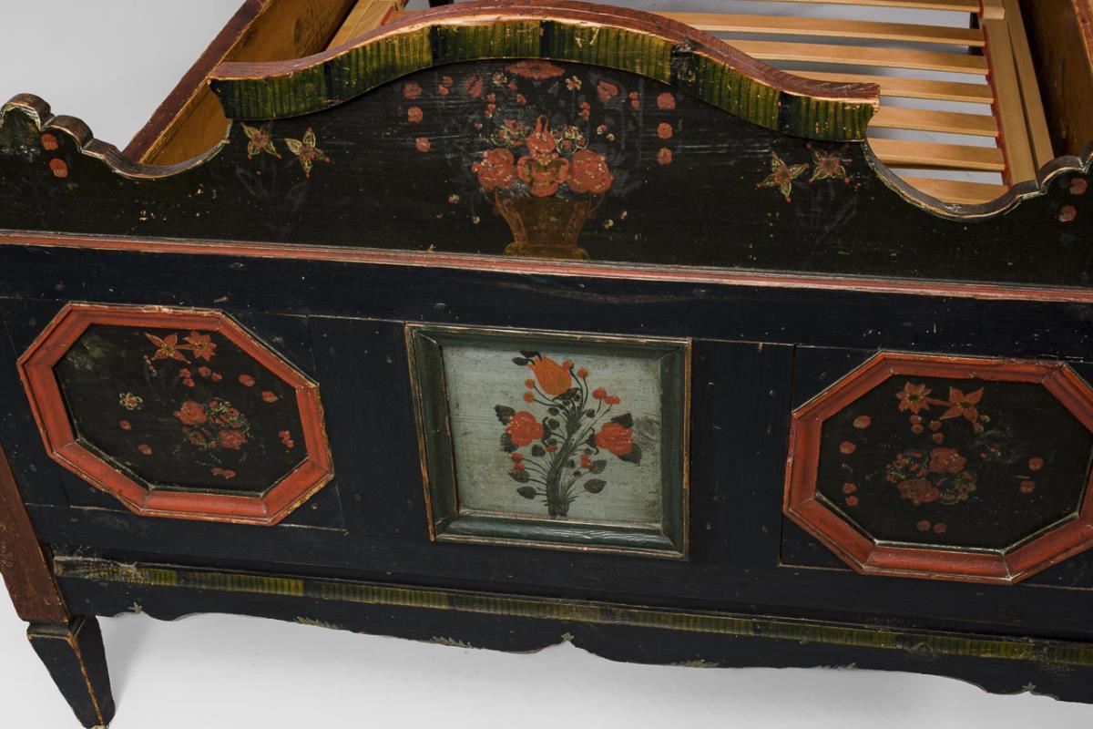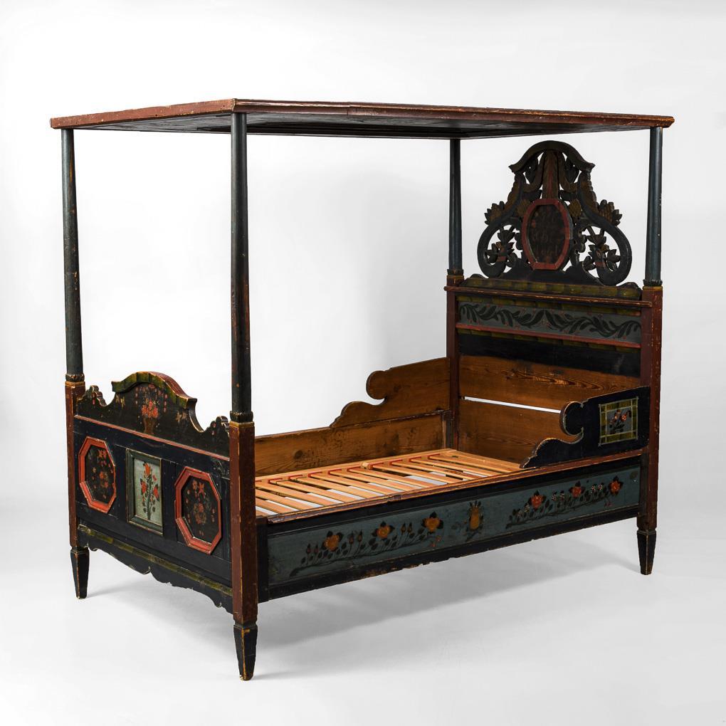 Bauern-Pfostenbett mit Himmel und aufsteckbarem Kopfteil, bemalt mit Blumen und Rankendekor, Kartusche im Kopfteil bezeichnet "ILE der Vater ABE in 1841". Alters-/Gebrauchsspuren, kleinere Fehlstellen, inaktiver Anobienbefall, Fassung mit Bereibungen, neuer Lattenrost als Zugabe.
