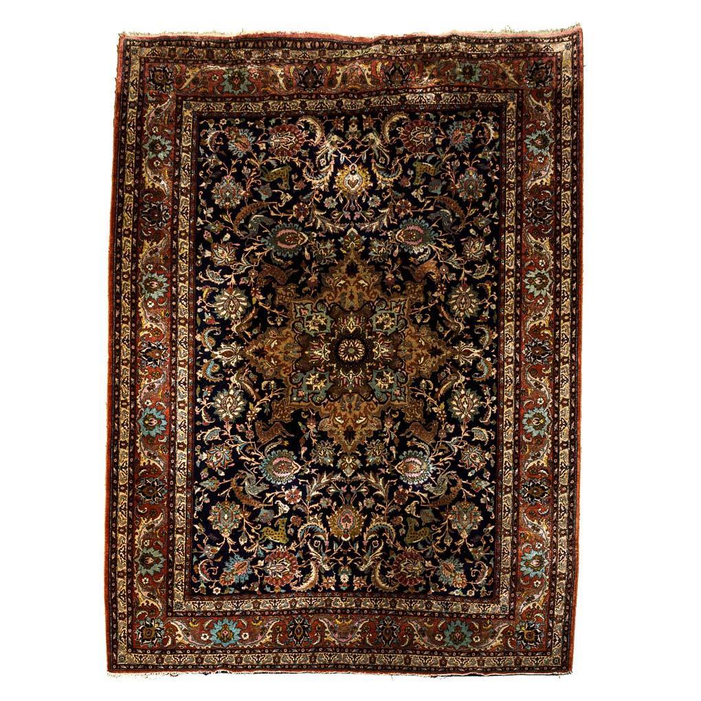 Sternmedaillon auf nachtblauem, floral durchgemustertem Mittelfeld mit Tiermotiven. Mehrreihige Bordüre mit Palmettenranken. Partiell Defekte an Flor, Rändern und Abschlüssen.