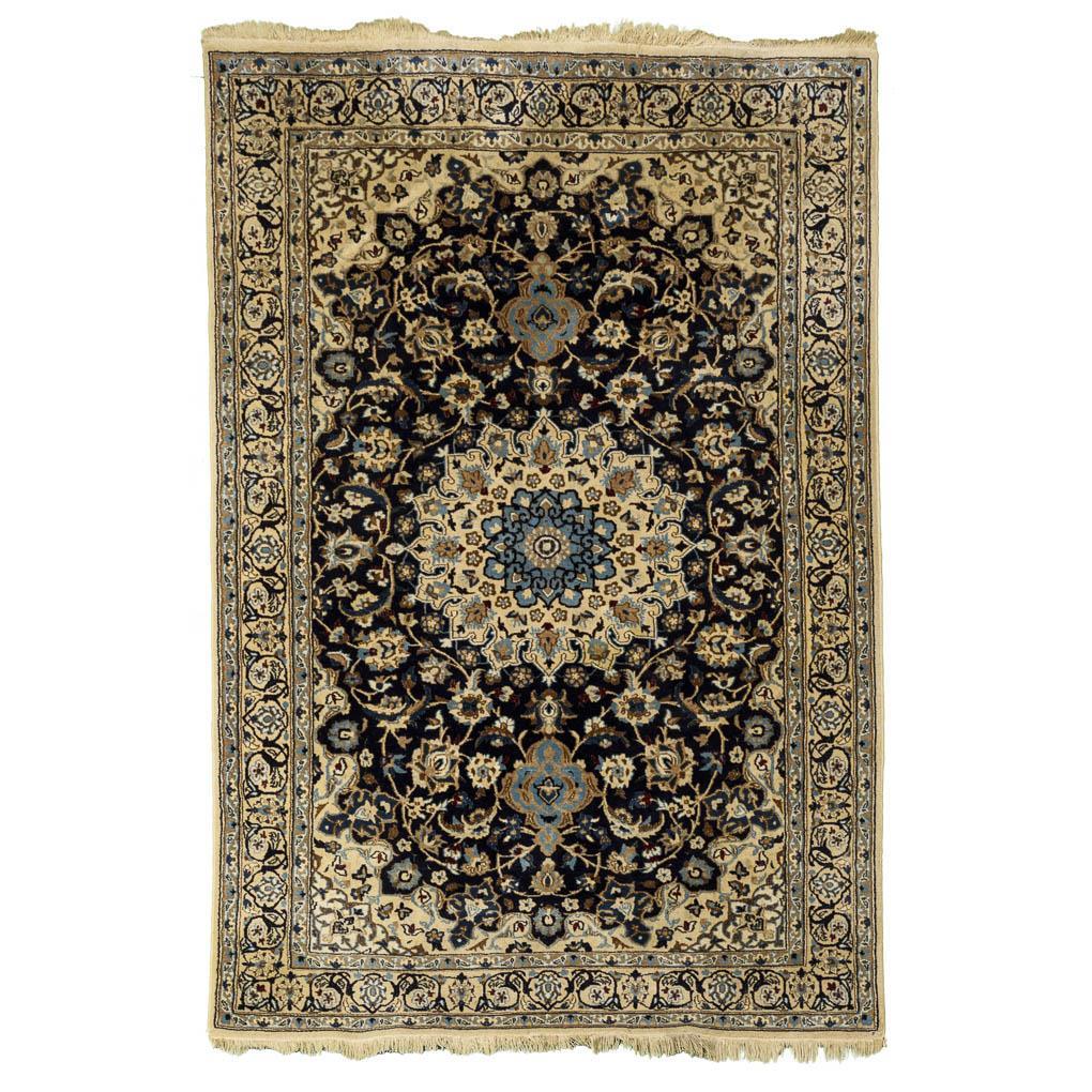 Wolle und Seide, feine Handknüpfung. Dekor in vorwiegend Blautönen und Elfenbein. 203 x 127 cm.