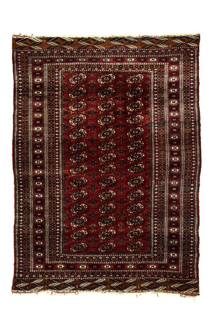 Gitternetz mit 3 x 14 kleinen Tekke-Göls und begleitenden Kurbagh-Göls. Breite, mehrreihige Bordüre mit geometrisiertem Floraldekor, Schmalseiten mit abschließendem Rautenmuster. Partiell kleine Defekte, defekte Fansen und Kanten, teils erneuert, Alters- und Gebrauchsspuren.