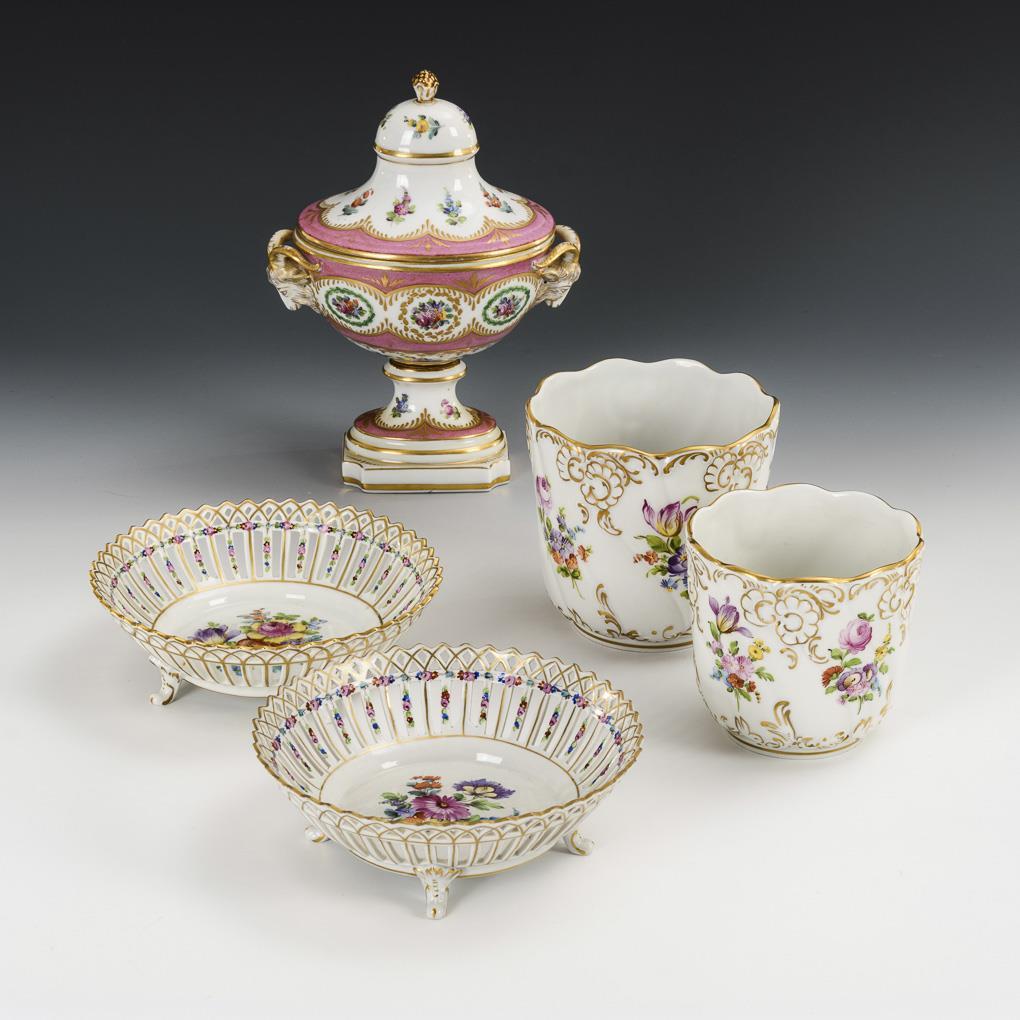 2 Durchbruchschalen, 2 Cachepots und 1 Deckelvase. Potschappel.