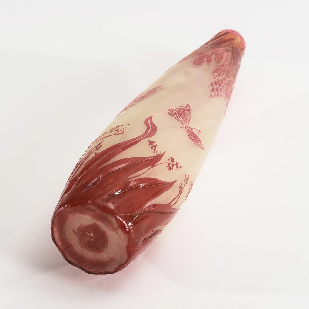 Schlanke, innen längsoptisch und außen schrägoptisch geblasene Vase. Umlaufend eine geätzte Wiese mit Schmetterlingen.