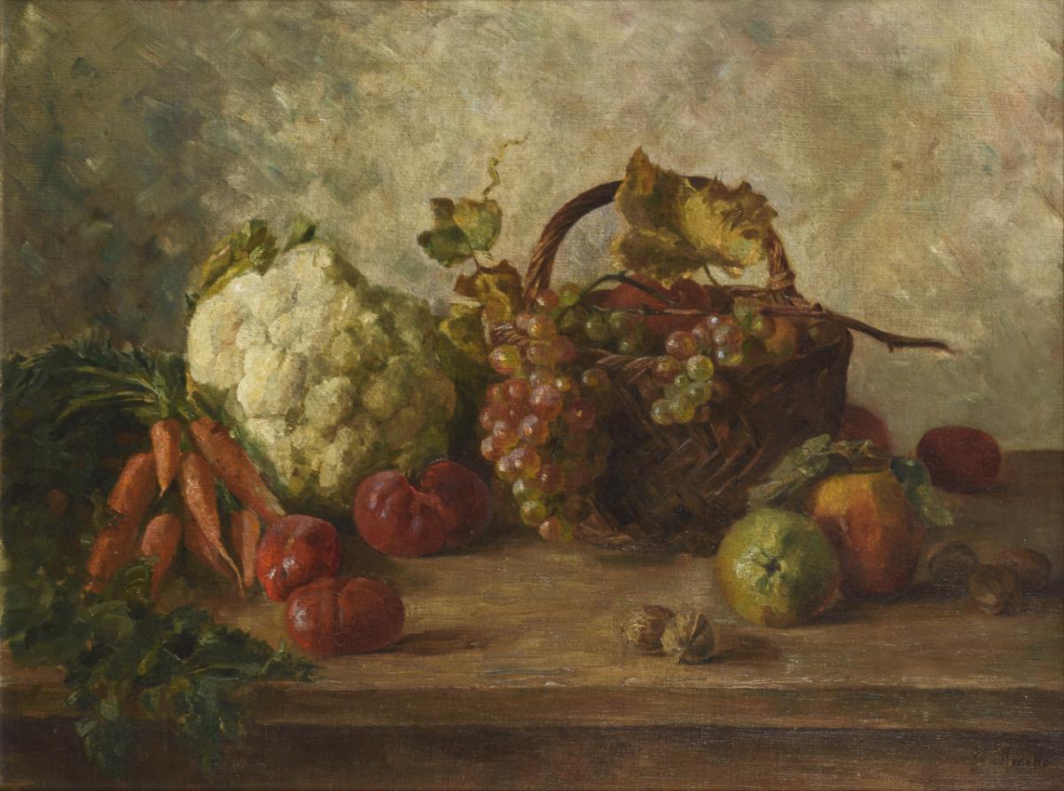 Undeutlich signiert: Stillleben mit Blumenkohl und Trauben
