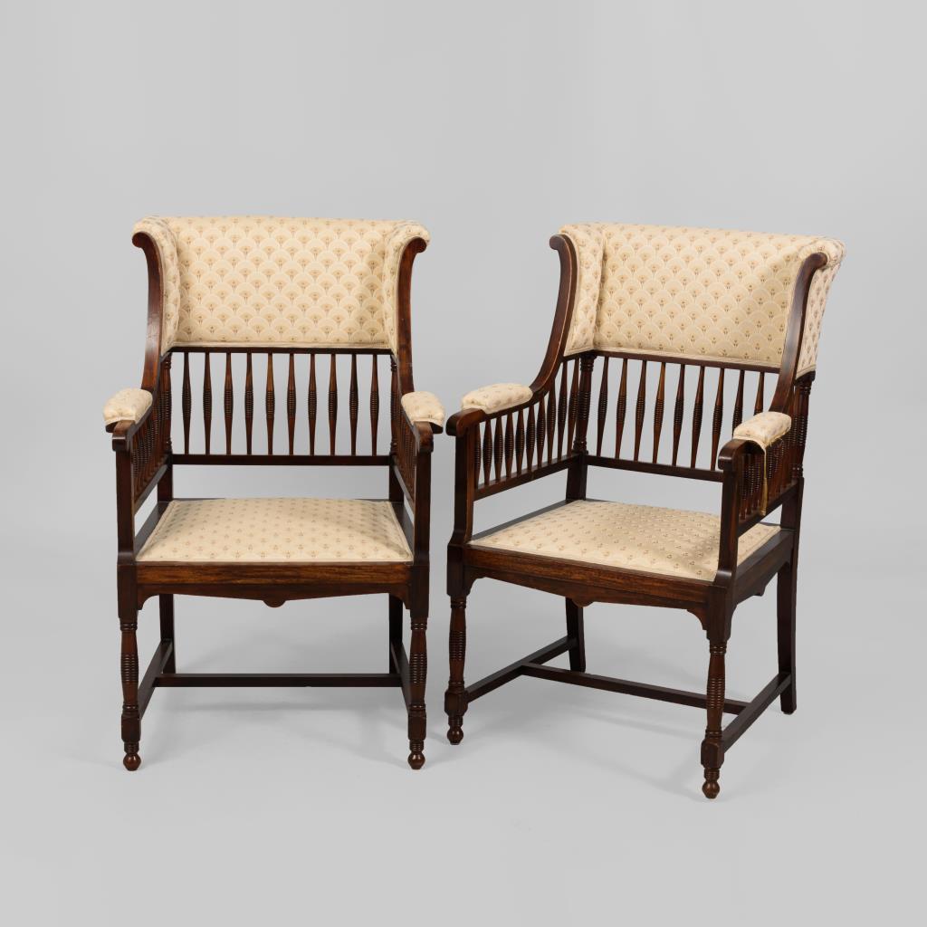 2 Armlehnstühle mit versprosstem Arm- und Rückenteil und ausladendem Schulterbereich, Polster mit stiltypischem Bezug. Restauriert, Alters-/Gebrauchsspuren, Polster und Bezug ergänzt.