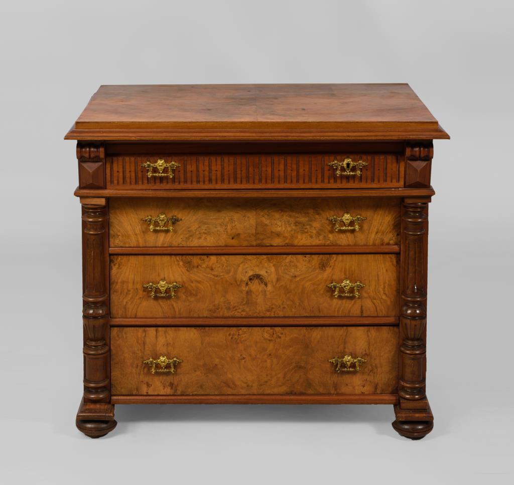 Blenderschrank in Form einer 4-schübigen Kommode, mit kanneliertem Kopfschub und Messingbeschlägen. Furnier mit kleineren Gebrauchsspuren.