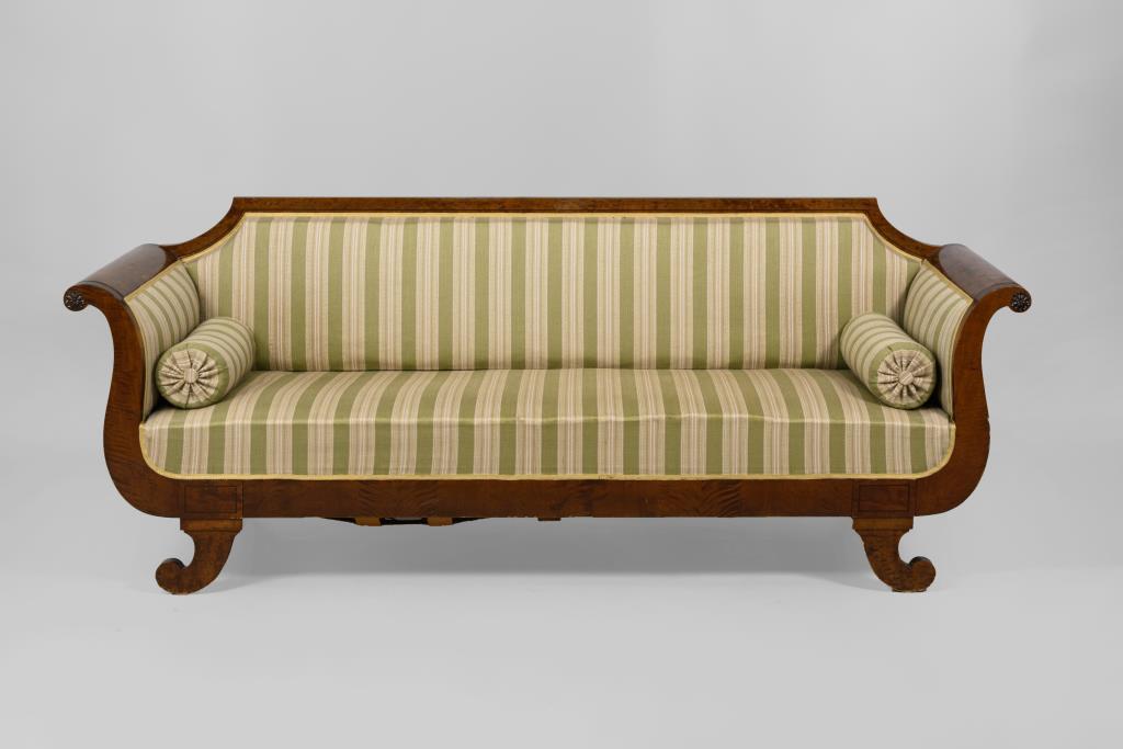 Stiltypisches Sofa mit volutierten Armlehnen und Füßen, Polster mit grün-weiß gestreiftem Bezug. Alters-/Gebrauchsspuren, Polster und Bezug ergänzt, Furnier mit kleinen Defekten.