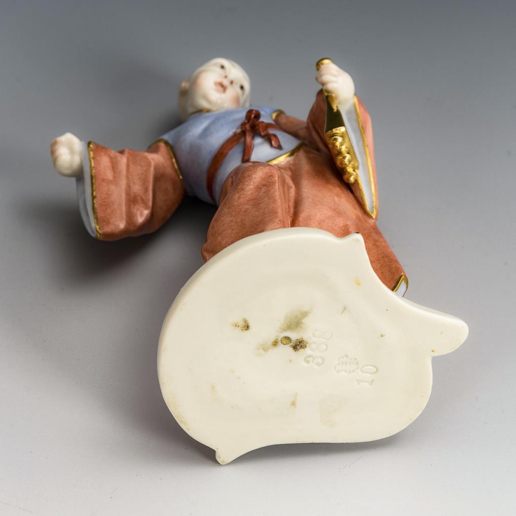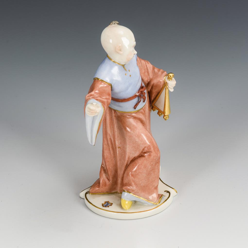 Auf einer Rocailleplinthe stehender Chinesenknabe mit Glockenspiel. Stab fehlt, Schleife bestoßen.
