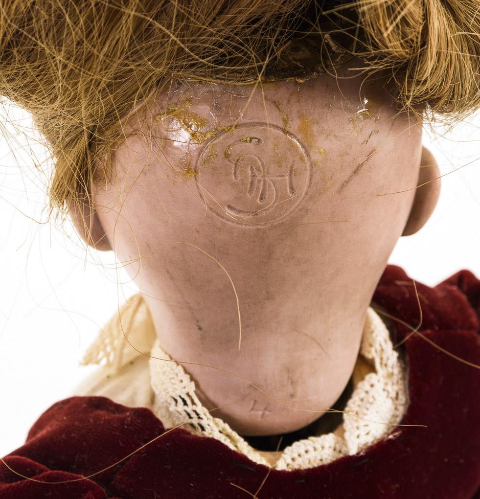 Kurbelkopf, blaue Schlafaugen, blonde Echthaarperücke. 9-teiliger Stehpuppenkörper. Weinrote Jacke, schwarzer Rock mit Blütenmuster, schwarze Schuhe, Strohhut. Kopf durchleuchtet: ohne Defekte.
