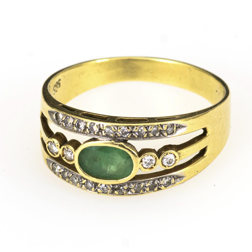 Gefasster Smaragd und 22 kleine, eingelassene Diamanten, zwischen breiter Schiene.