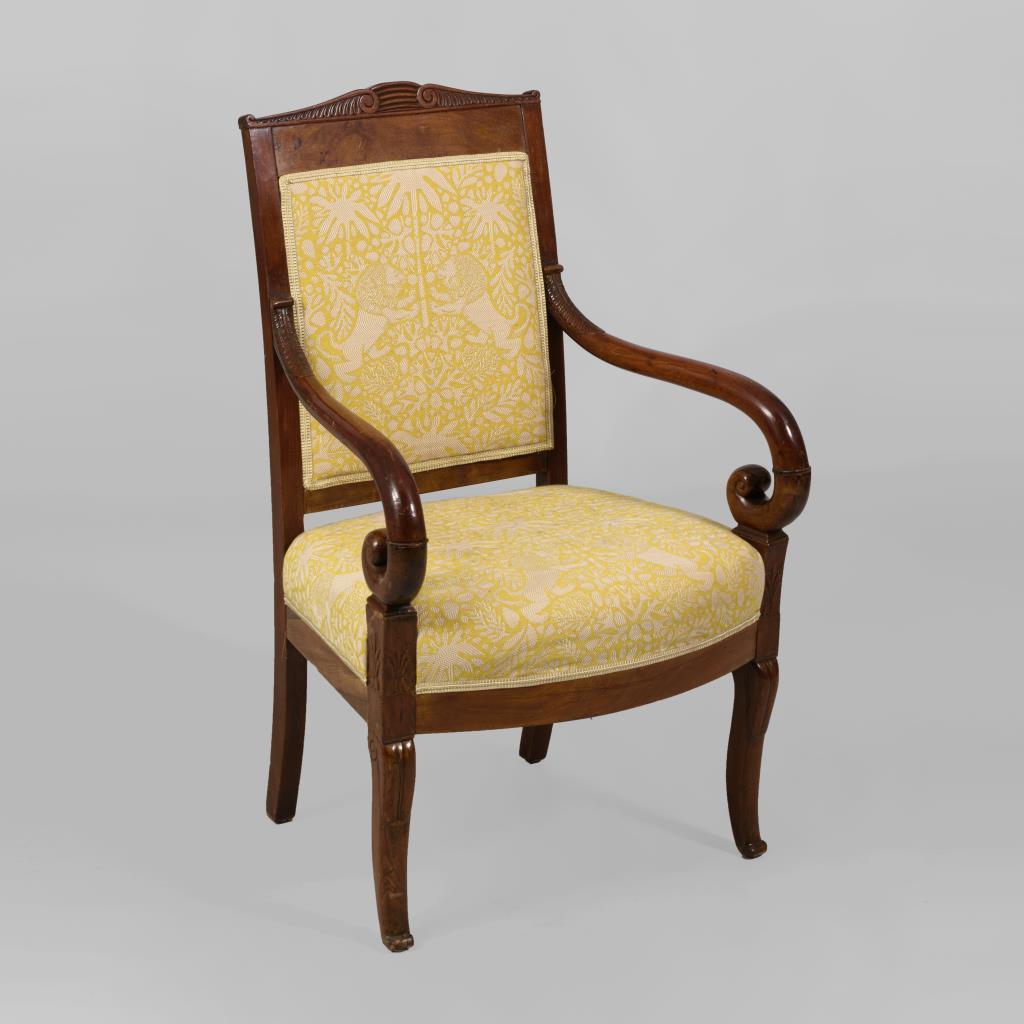 Polsterstuhl mit volutierten Armlehnen und Flachschnitzereien mit Jugendstil-Ornamenten, Polster mit gelblichem Floralbezug. Restauriert, kleinere Gebrauchsspuren, Polster und Bezug ergänzt.
