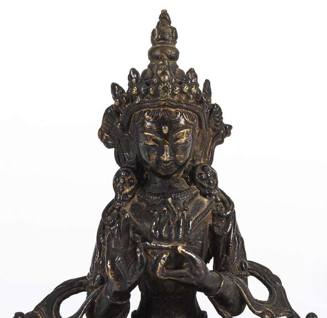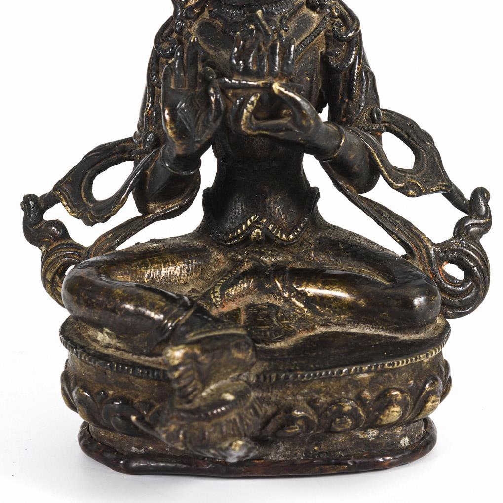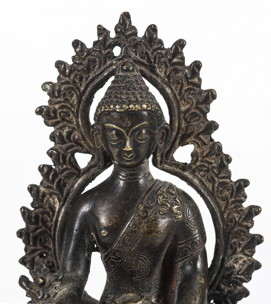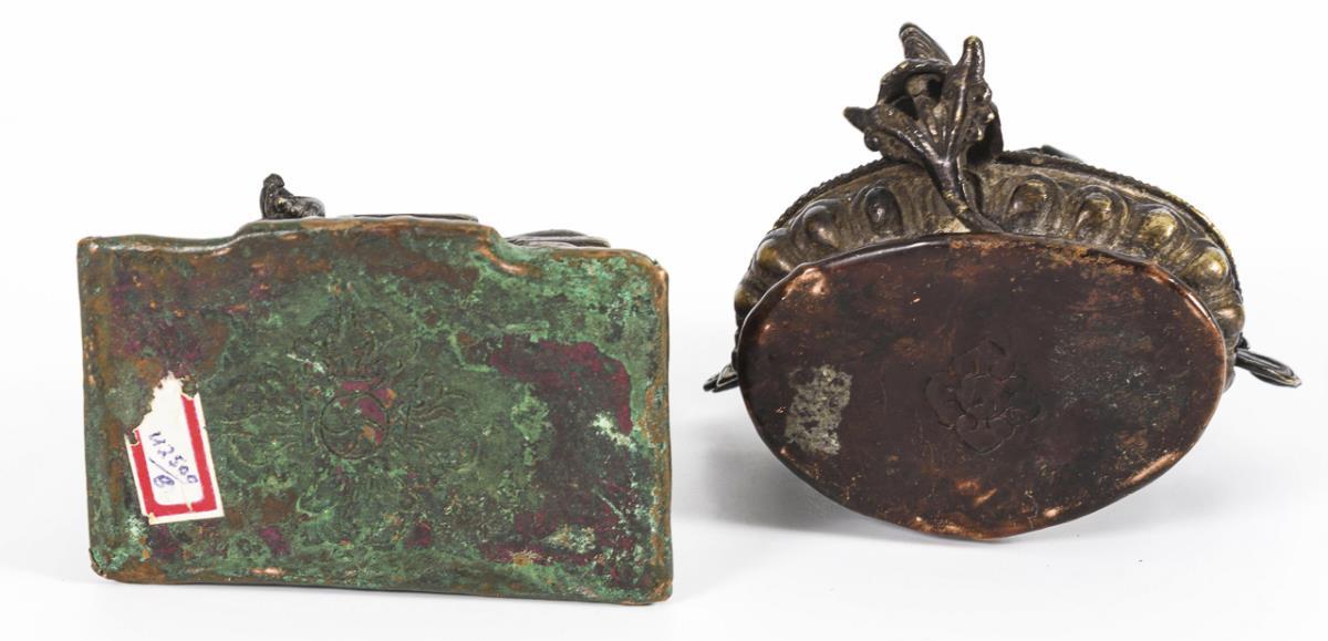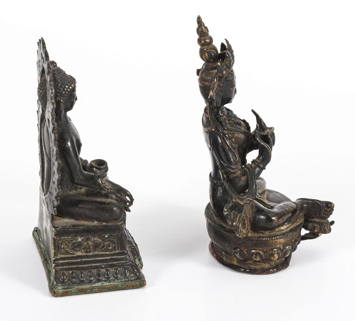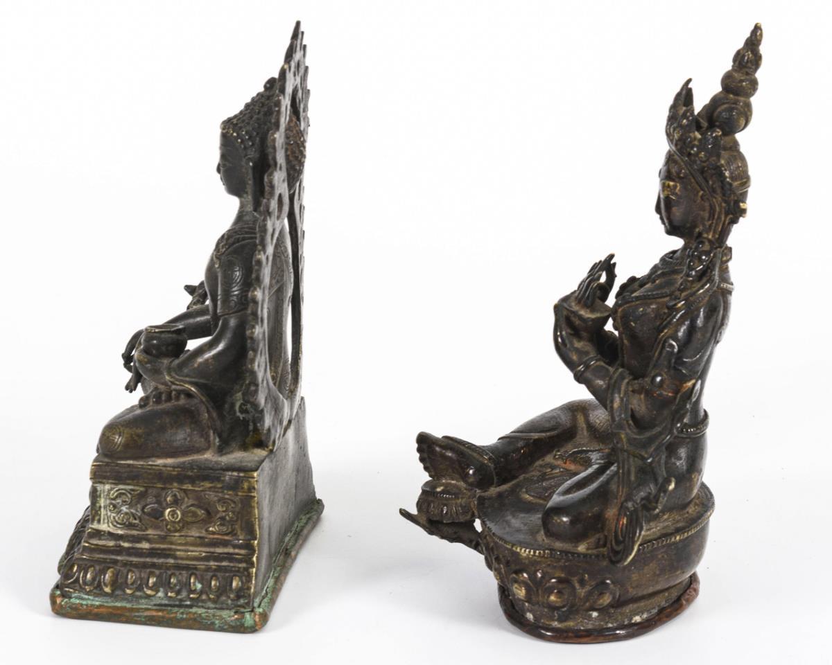 Buddha im Verschränkungssitz mit Almosentopf, eine Blüte haltend. Mandorla und eckiger Sockel mit Elefantenreliefs. Sorgfältige Ausführung, Boden geschlossen. / Tara im gelösten Sitz auf Lotosthron. In den Händen eine Flammenschale. Ebenfalls in sorgfältiger Ausführung. Geschlossener Boden.