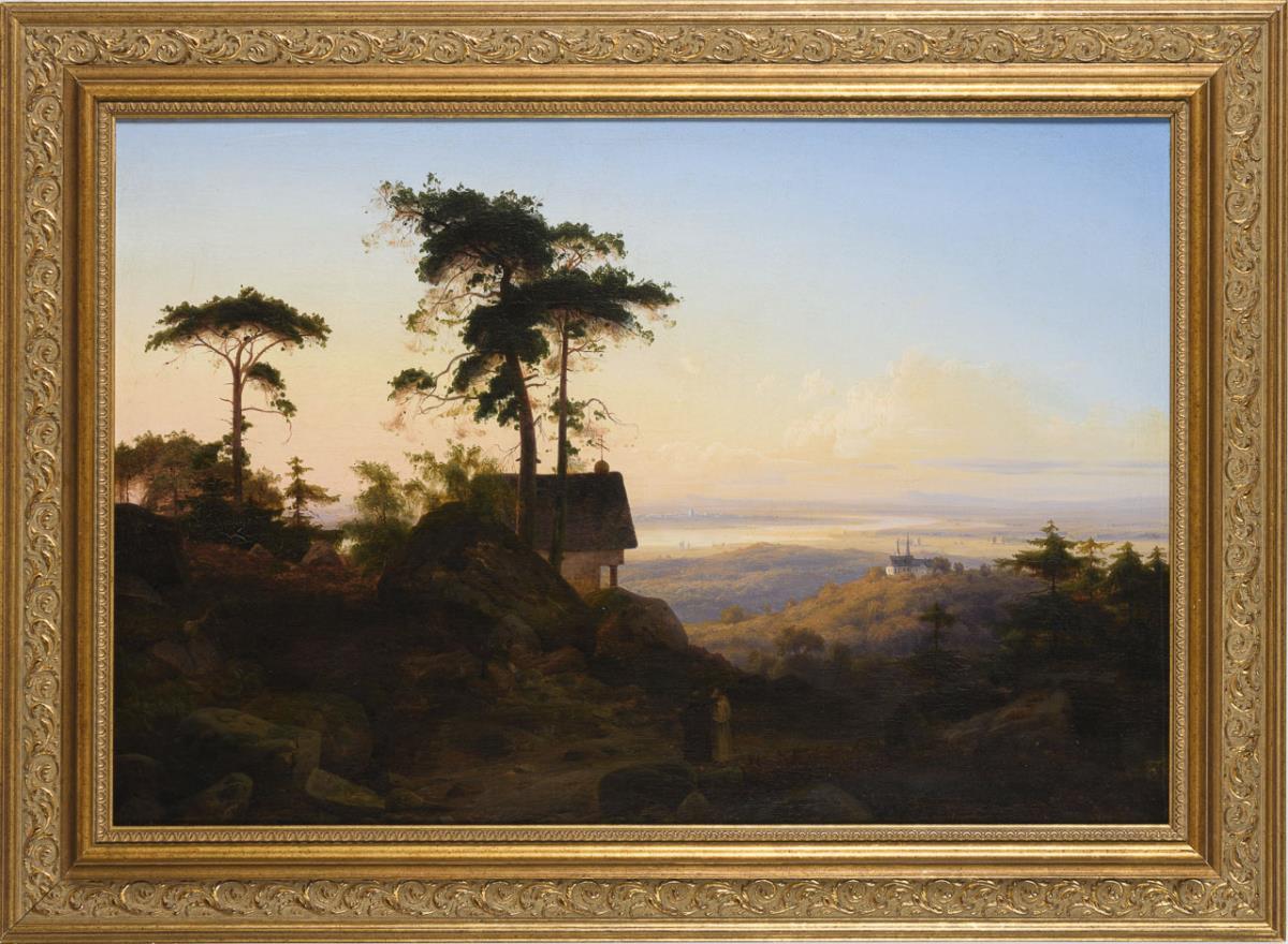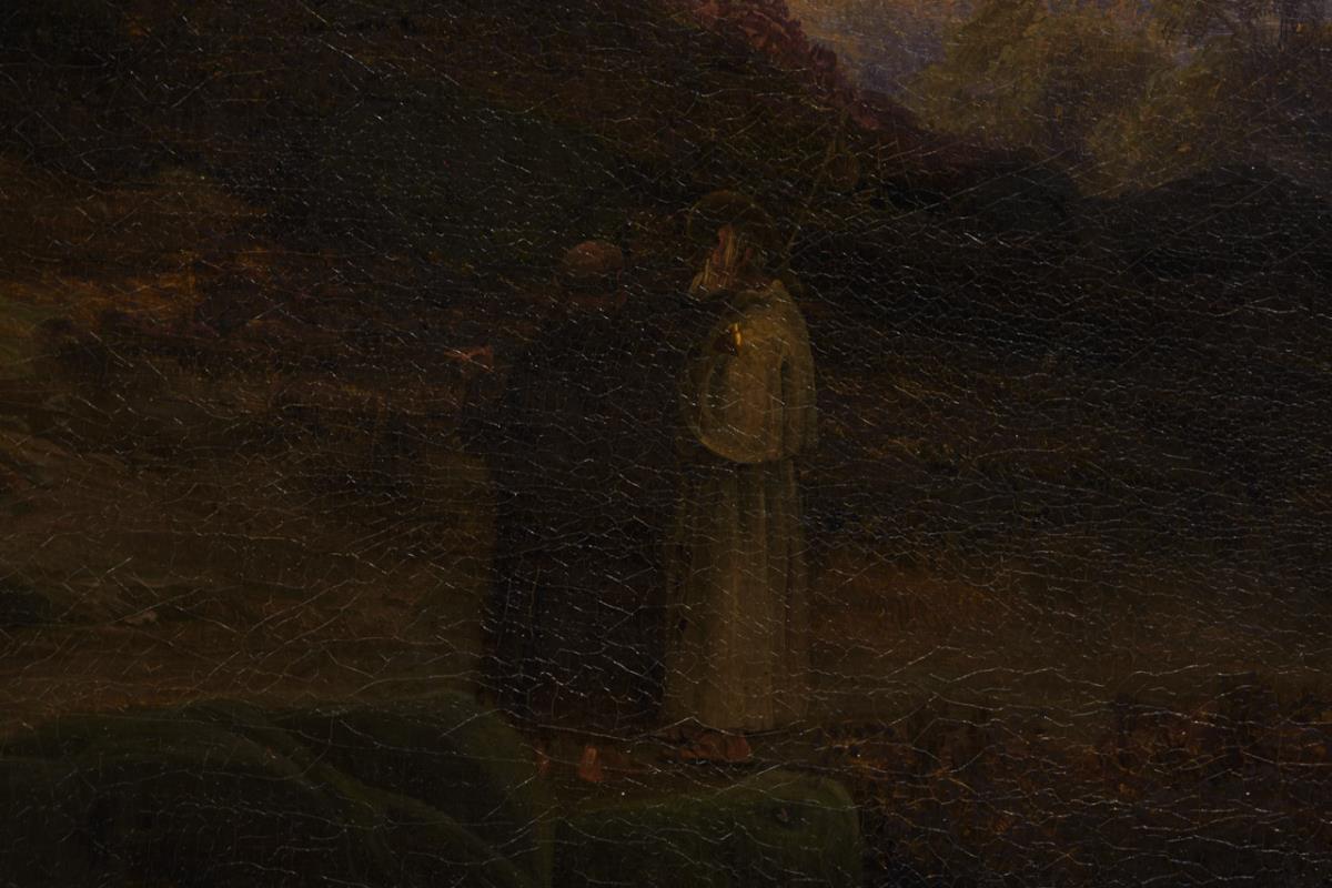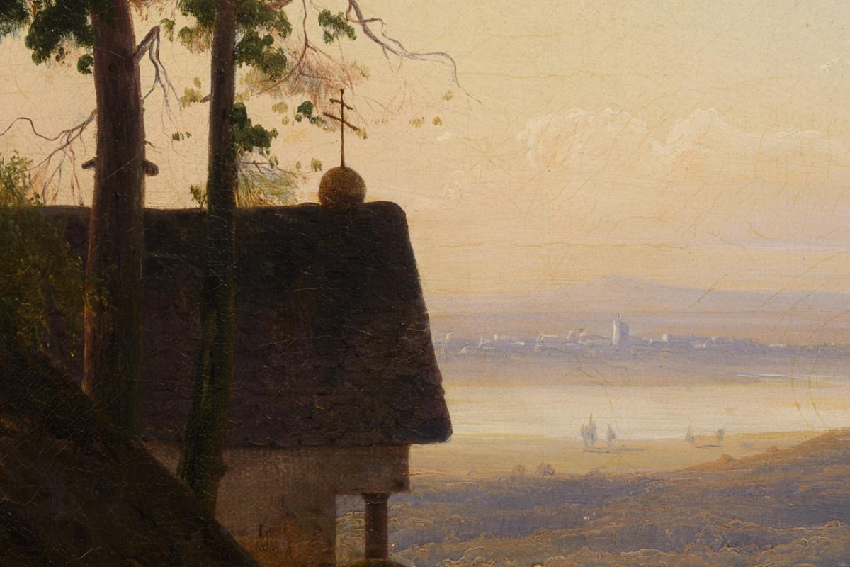 Bergkapelle mit Geistlichen und weitem Blick hinab in die Ebene mit dem Fluss im stimmungsvollen Abendlicht. Leinwand teilweise randdoubliert.