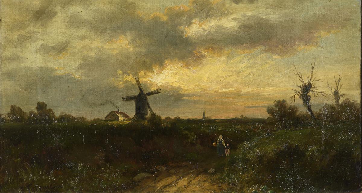 Mutter und Kind auf einem Weg nahe der Mühle bei untergehender Sonne. Leichte Altersspuren.