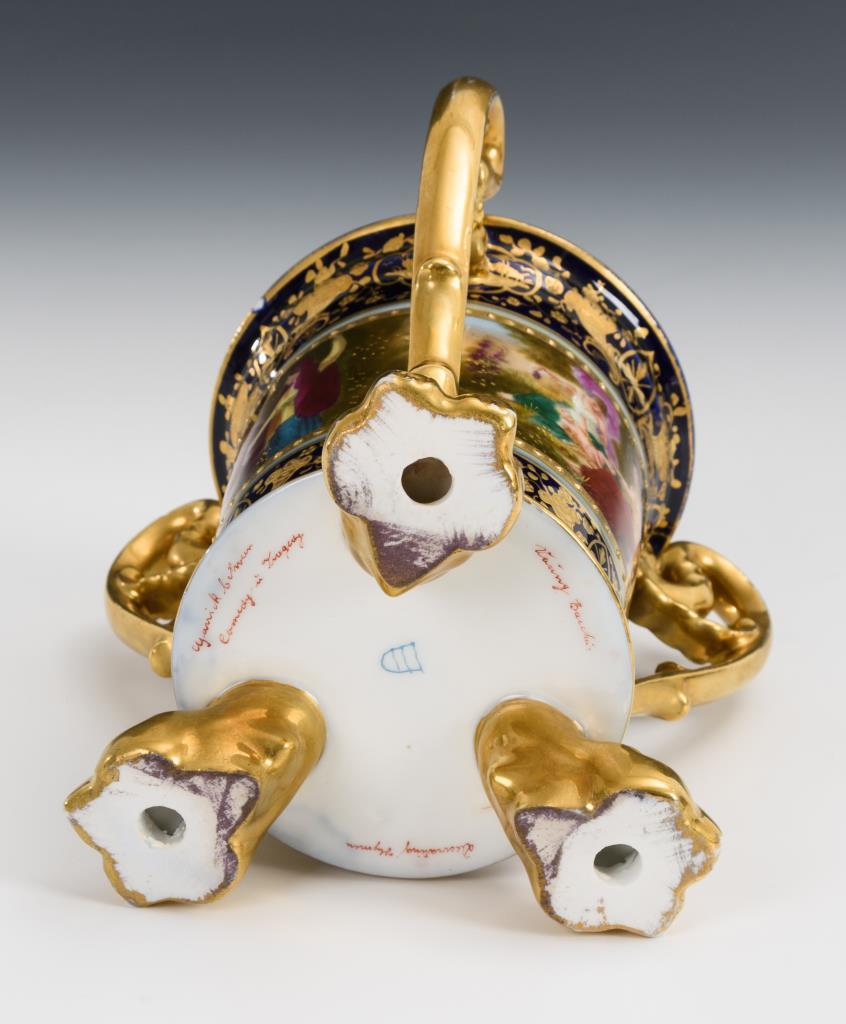 Beide mit farbigem, gold ornamentierten Teilfond und mythologischen Darstellungen, Becher innen vergoldet. Gold etwas berieben.
