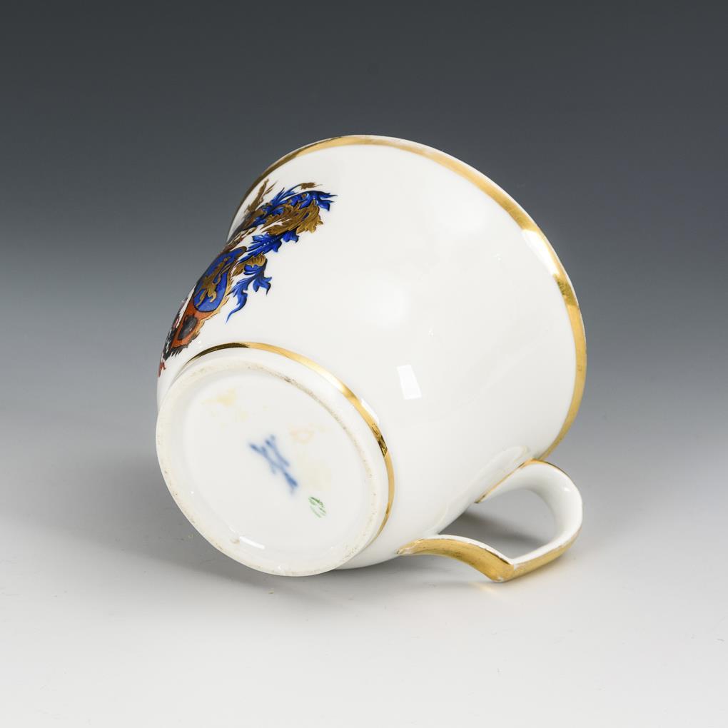 Glockentasse mit Ohrenhenkel. Schauseitig ein Wappen mit einem dreiteiligen Wappenschild mit Löwe, drei Kugeln und Schwan. Gold etwas berieben, Silber minimal berieben.