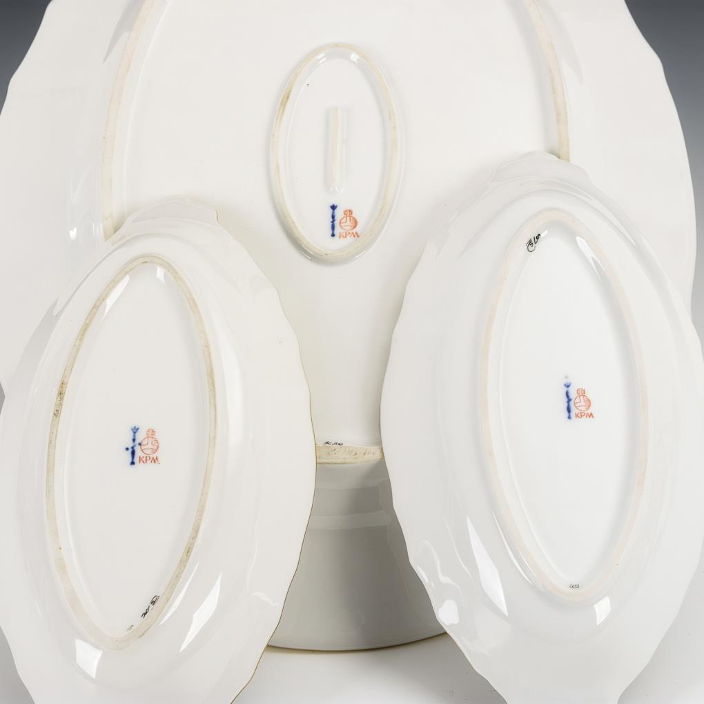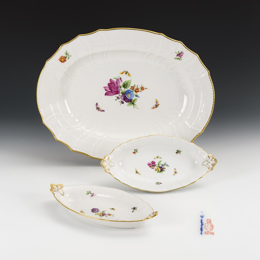 Große Platte und 2 Schalen mit Blumen- und Insektenmalerei. KPM Berlin.